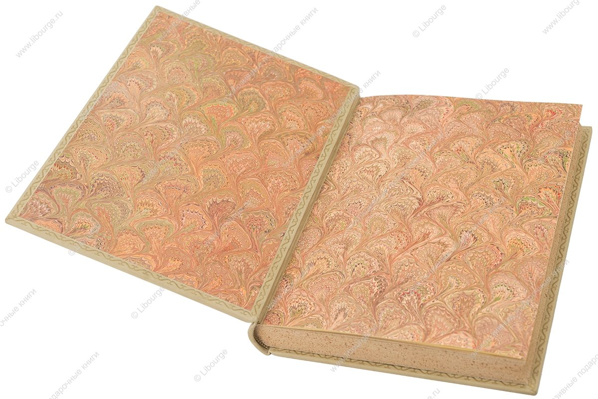 Французский кожаный переплет на шнурах. Кожа специальной выделки, искусственно состаренная. Сложным составным тиснением полностью воспроизведен оригинальный рисунок оформления обложек книги. Верхний обрез окрашен и гравирован вручную орнаментом с золочением. Нижний и передний обрезы окроплены. Форзацы из мраморной бумаги ручного окрашивания (Италия), на кожаной слизуре. Дублюра выполнена вручную блинтовым тиснением. Возможно изготовление подарочного футляра на выбор.