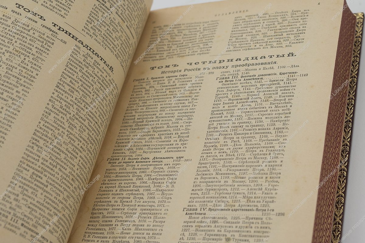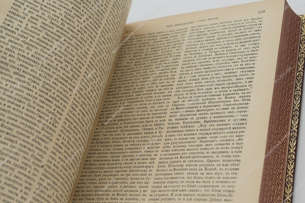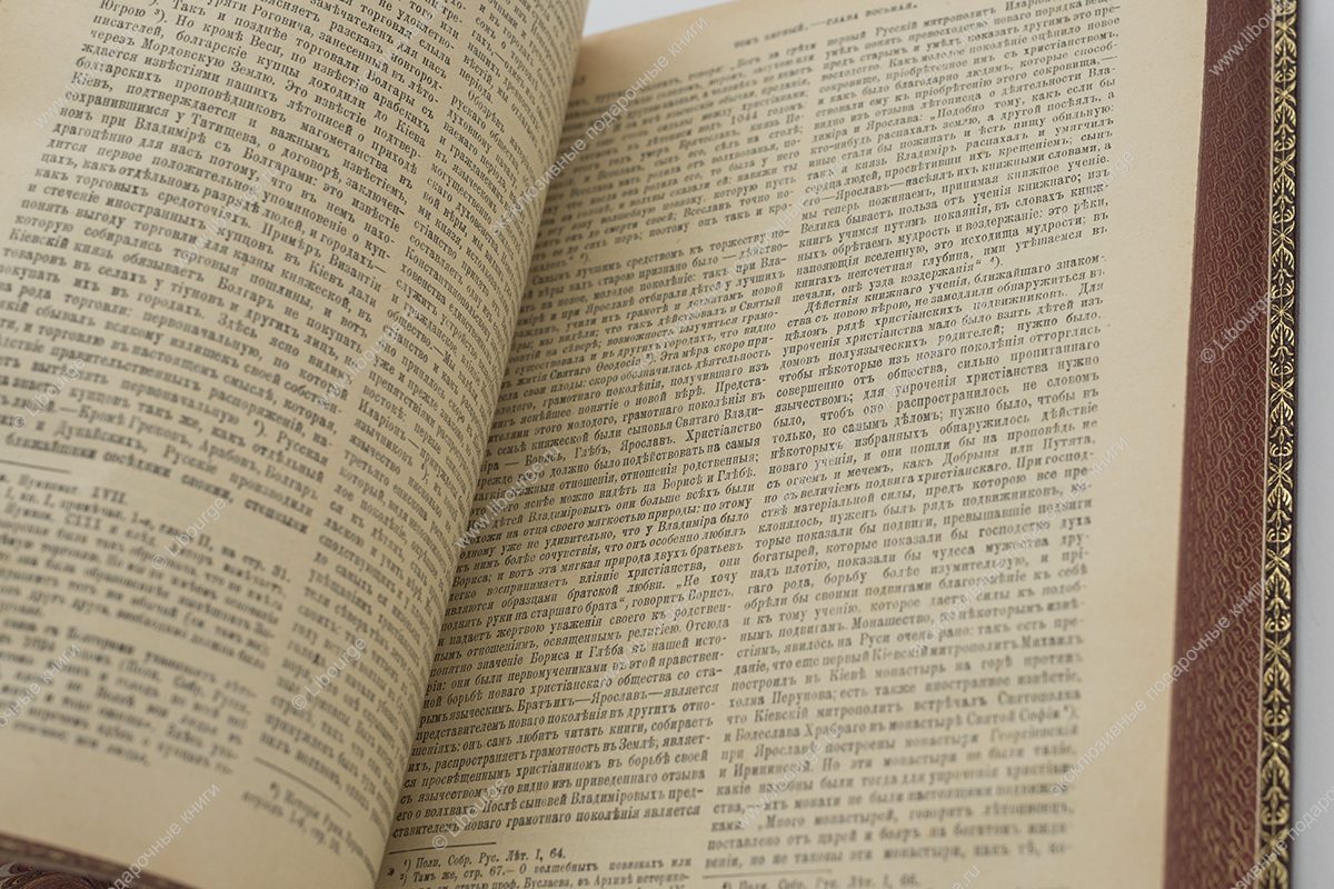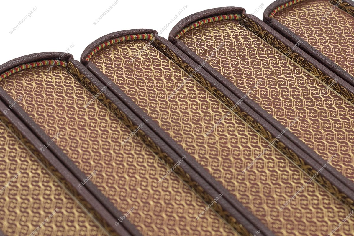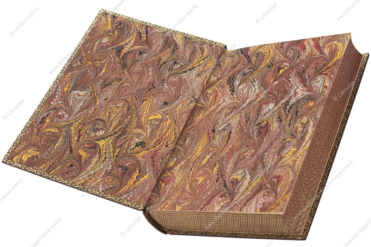 Цельнокожаный французский переплет ручной работы на шнурах. Тиснение на обложке с золочением. На корешке вставки из цветной кожи и тиснение золотом. Обрезы гравированы с золочение с трех сторон. Форзац из мраморной бумаги ручного окрашивания. Возможно изготовление подарочного футляра на выбор.