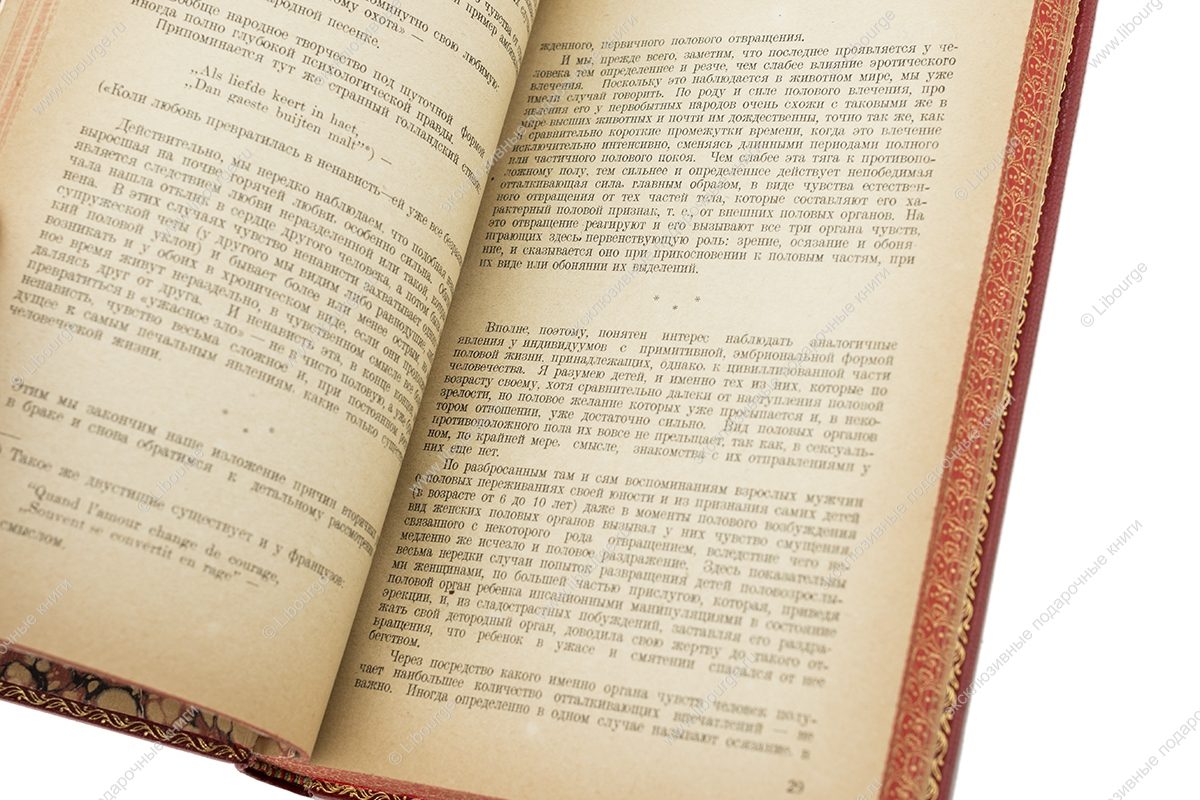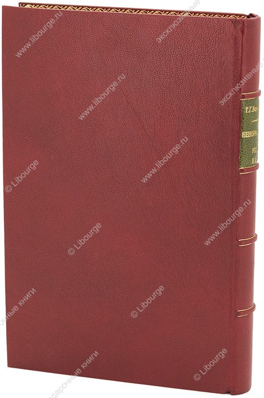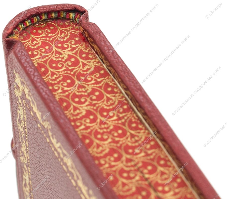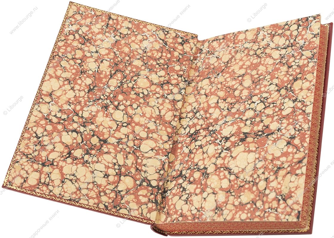 Французский кожаный переплет ручной работы. Форзац из мраморной бумаги ручного окрашивания. Обрезы с трех сторон окрашены в красный цвет и гравированы золотым орнаментом вручную. Возможно изготовление подарочного футляра на выбор.