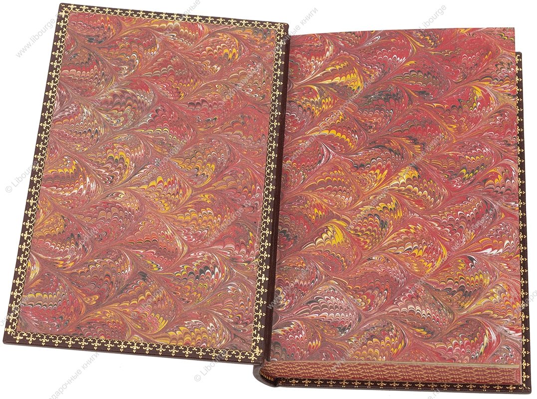 Французский кожаный переплет ручной работы. Шагреневая кожа бордового цвета. Тиснение золотой фольгой. Художественная роспись по коже. Обрезы окрашены в красный цвет и гравированы вручную орнаментом с трех сторон. Форзацы из мраморной бумаги ручного окрашивания. Дублюры окатаны орнаментом с четырёх сторон. Полукожаный подарочный футляр.