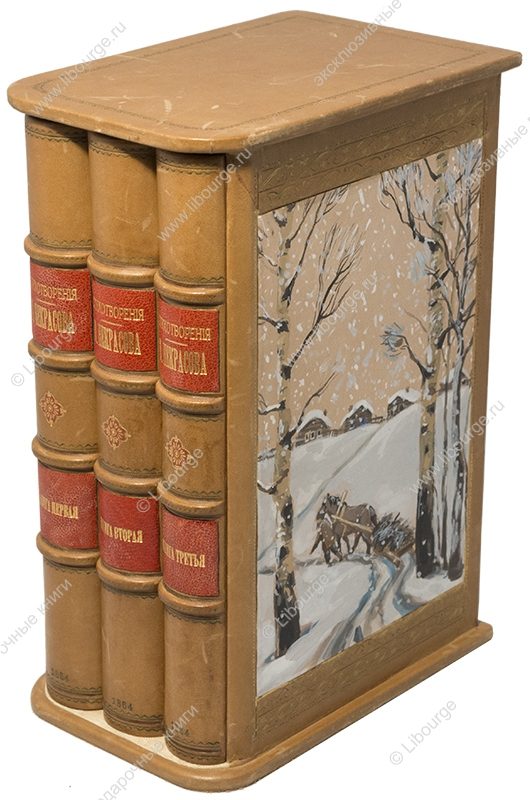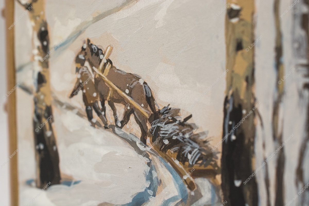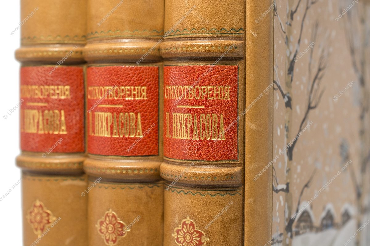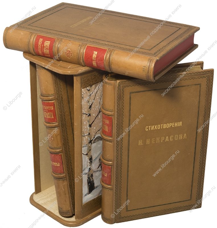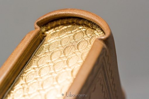 Французский кожаный переплет ручной работы. Художественная роспись по коже. Золотое и блинтовое тиснение. Обрезы окрашены, позолочены и торшонированы с трех сторон. Форзацы из белого муара на кожаных слизурах. Цельнокожаный подарочный футляр.