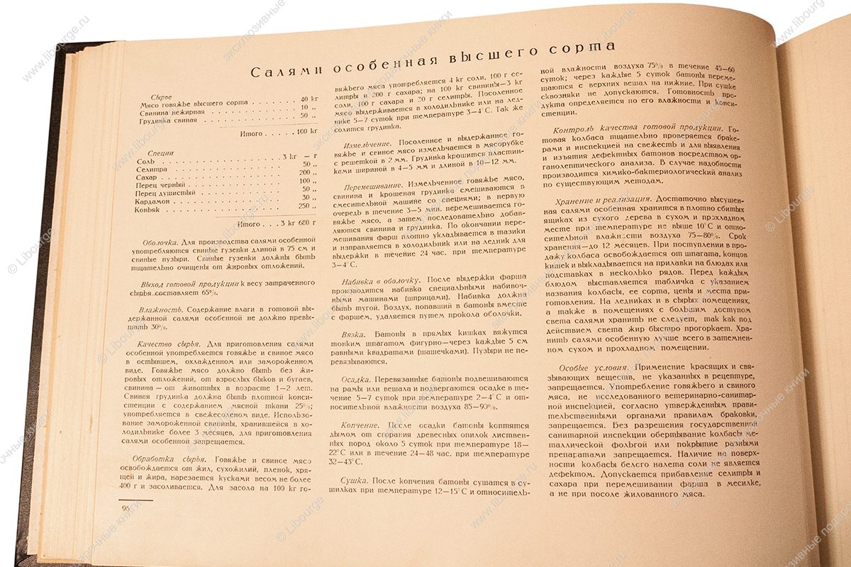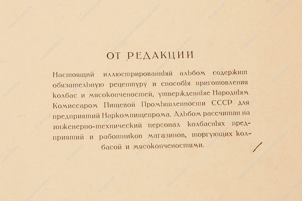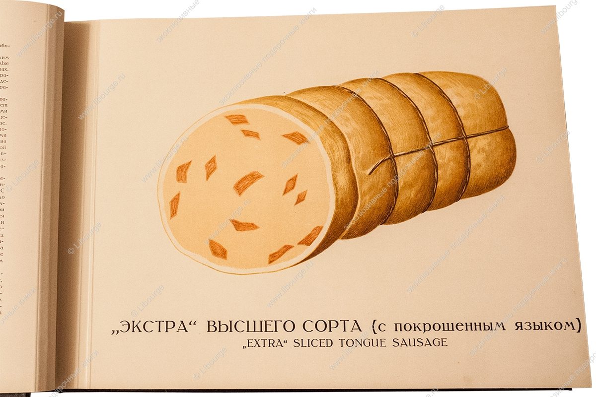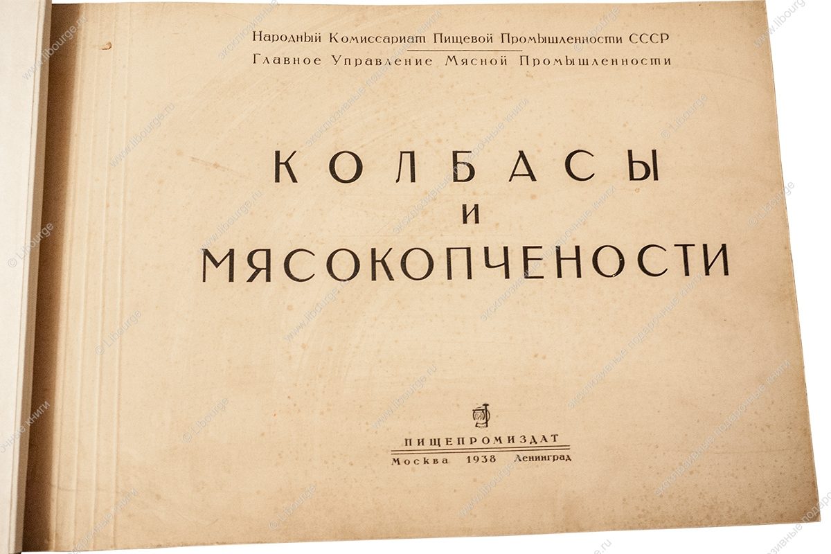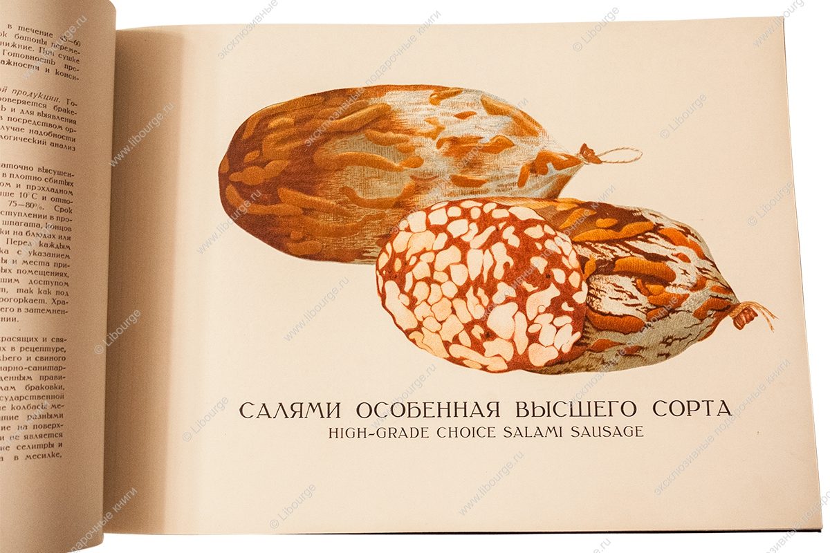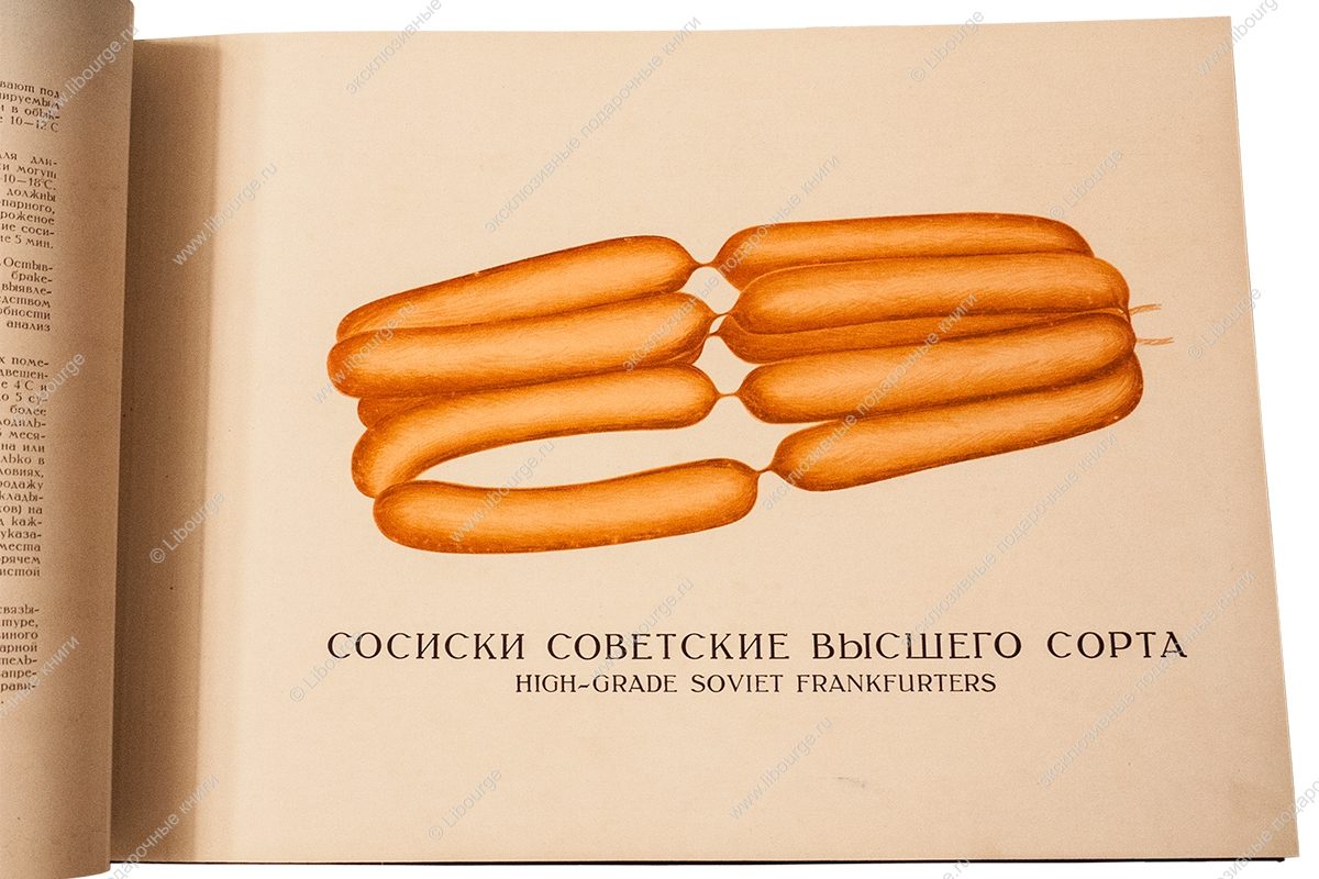 Весомым аргументом победы советской пищевой промышленности стало издание альбома «Колбасы и мясокопчёности» в 1938 году. Вес издания следует понимать в буквальном смысле. Поражали и его габариты - по длинной стороне почти полметра. Альбом сделан по типу старых атласов природы. Иллюстрации напечатаны в технике цветной литографии с одной стороны листа. Мясные продукты воспринимаются фантазиями художника В.И. Логинова, столь диковинно они выглядят для того времени. Чтобы разрешить сомнения, к альбому прилагался бесплатный «Прейскурант розничных и оптовых цен» с указанием цен на продукты - Полукопчёная, Любительская, Туристские колбаски, Зельц, Французский, Мясные хлебы, Сырный и др. Брошюра составлена как таблица, в графах указаны вид, сорт, страница в альбоме, розничные цены за 1 кг, отпускные цены за 1 центнер (в руб. и коп. по поясам). Самое фантастическое в книге не рисунки - шахматный, паркетный, абстрактно-геометрический, образованные жирами и белками, а цена издания - 250 рублей.