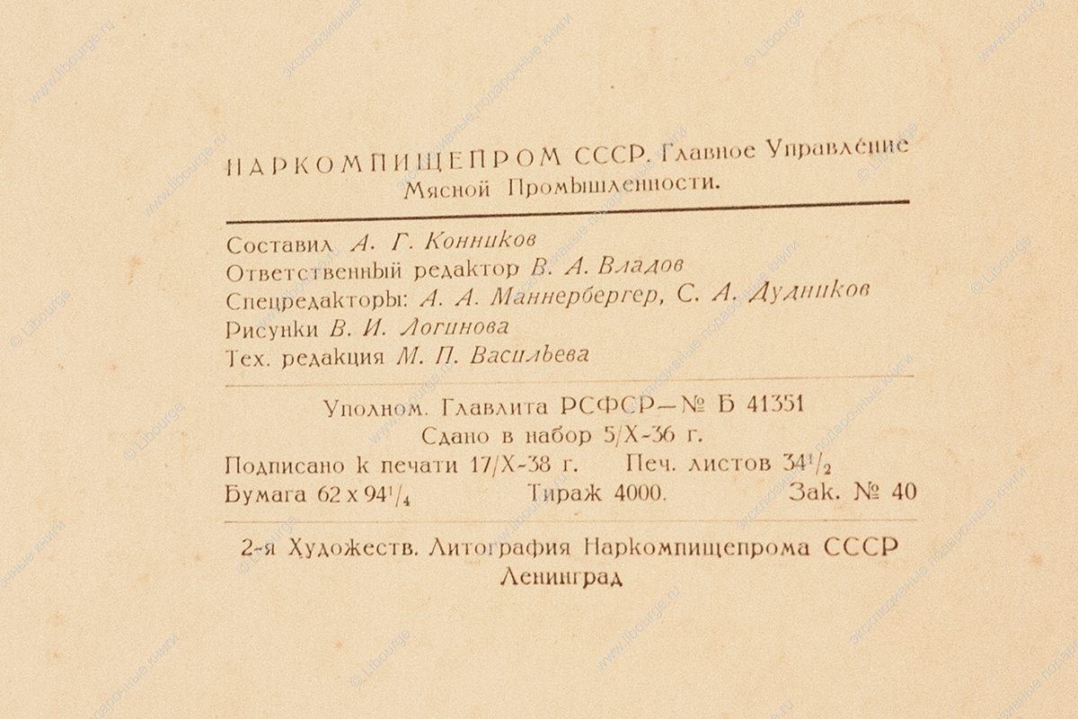 Редкое советское издание "Колбасы и мясокопчености". Составитель А. Г. Конников. 2-я художественная литография Наркомпищепрома СССР, Ленинград. Тираж 4000 экз. Цена 250 руб (1938).