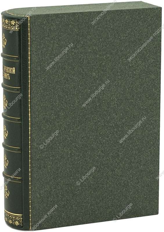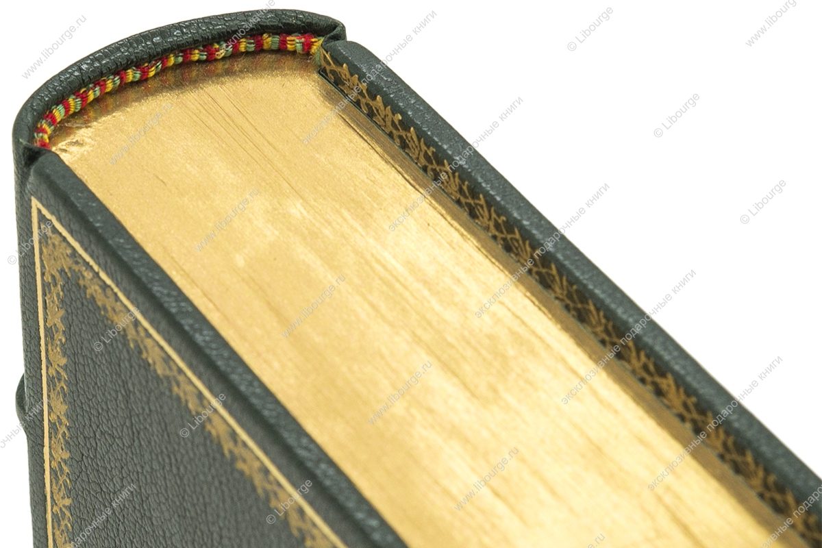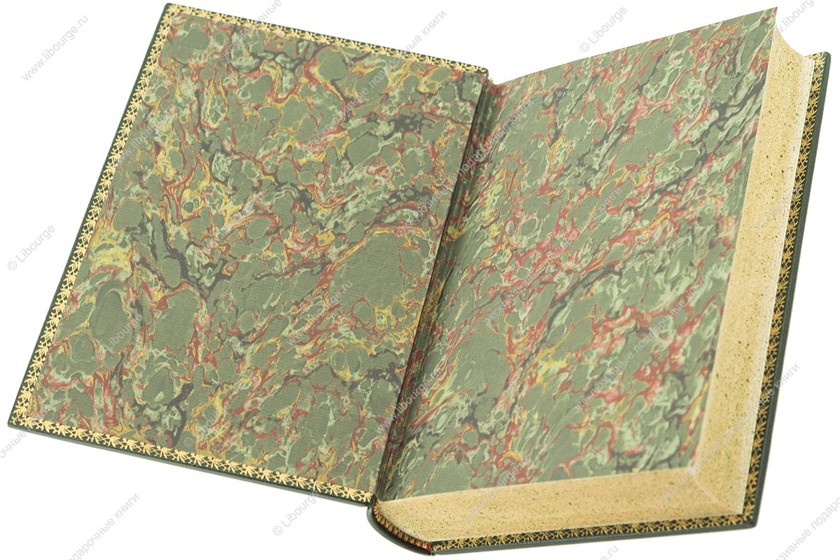Французский переплет ручной работы. Шагреневая кожа. Тиснение золотом. Форзац из мраморной бумаги. Верхний обрез золоченый. Передний и нижний обрезы крапленые. Подарочный полукожаный футляр.