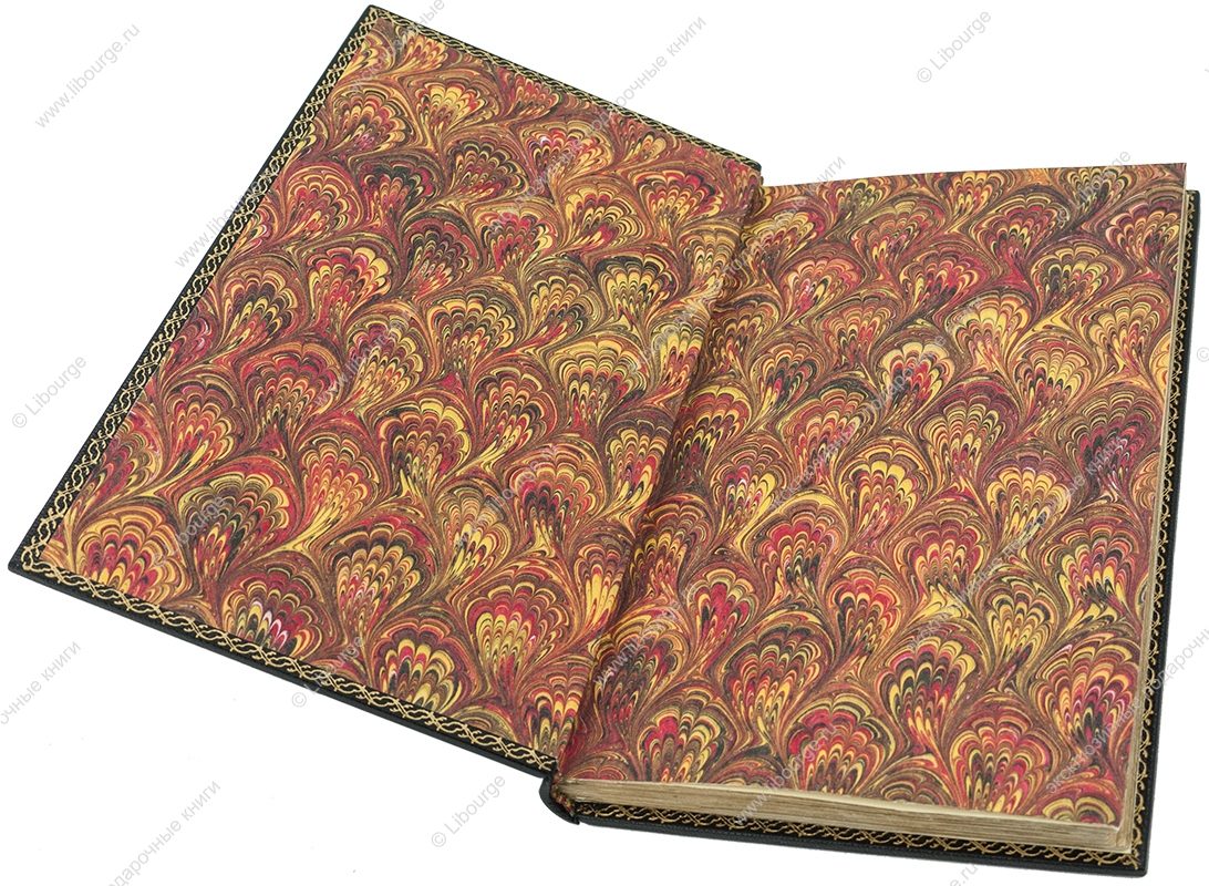 Французский цельнокожаный переплет ручной работы. Шагреневая кожа черного цвета. Тиснение золотом на обложке.Форзац из мраморной бумаги ручного окрашивания с окантовкой золотом орнаментом. Возможно изготовление подарочного футляра на выбор.