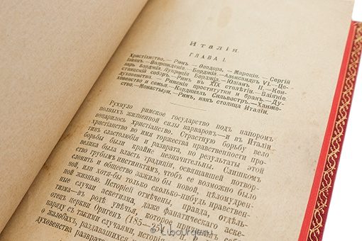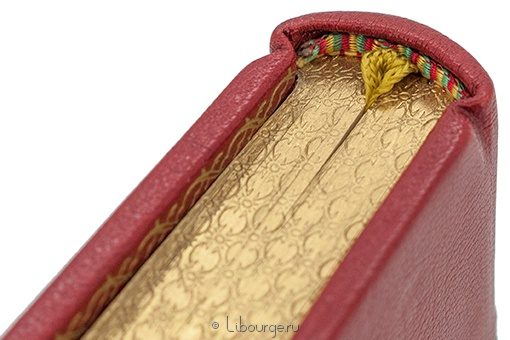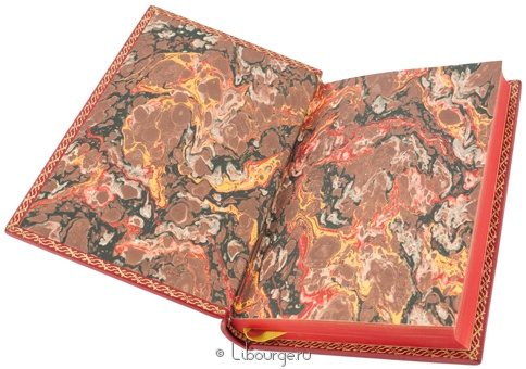 Кожаный французский переплет ручной работы. Шагреневая кожа. Верхний обрез золоченый и гравированный орнаментом, нижний и боковой обрезы - окрашены в цвет кожи переплета. Шелковый каптал. Шелковое ляссе. Форзац из мраморной бумаги ручного окрашивания. Возможно изготовление подарочного футляра на выбор.