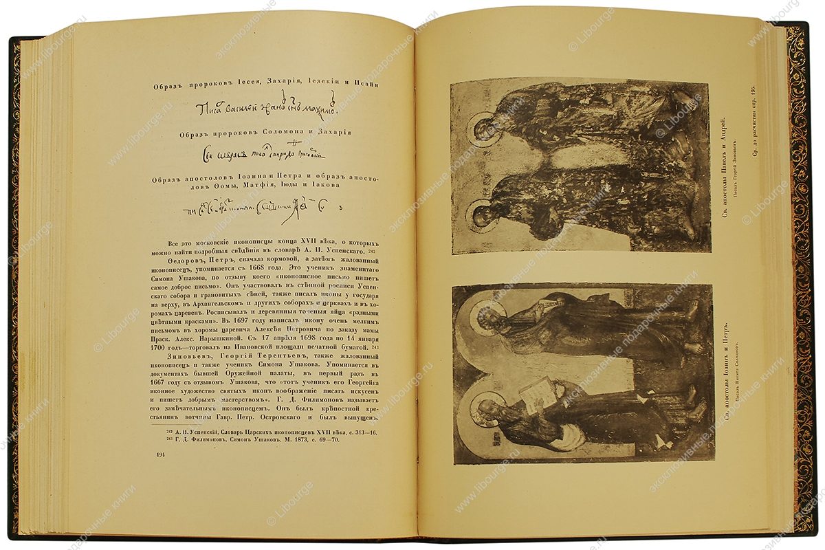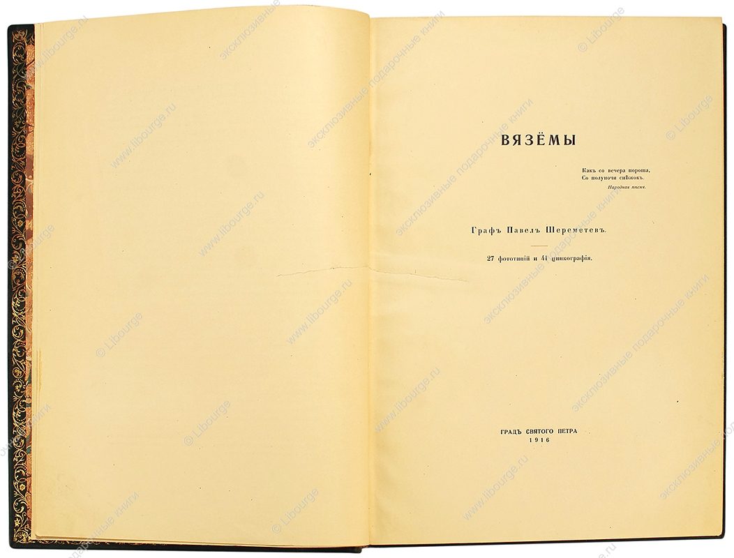 Книга посвящена одному из самых красивых усадебных комплексов в России под названием Вяземы, древней вотчины Бориса Годунова и затем князей Голицыных. На его территории находится Спасо-Преображенская церковь с пятью золочеными куполами, двухэтажный дом, построенный потомком князя Бориса Алексеевича Голицына и уютный парк на берегу пруда. Во времена русско-французской войны в поместье останавливались на ночь Наполеон и Кутузов, частыми посетителями усадьбы были А. С. Пушкин, Н. В. Гоголь, Л. Н. Толстов и дургие. Автор данного произведения – один из представителей знаменитого рода Шереметевых, историк, общественный деятель и художник Павел Сергеевич Шереметев (1871 – 1943). Редкое прижизненное издание с 27 фототипиями и 41 цинкографией.
