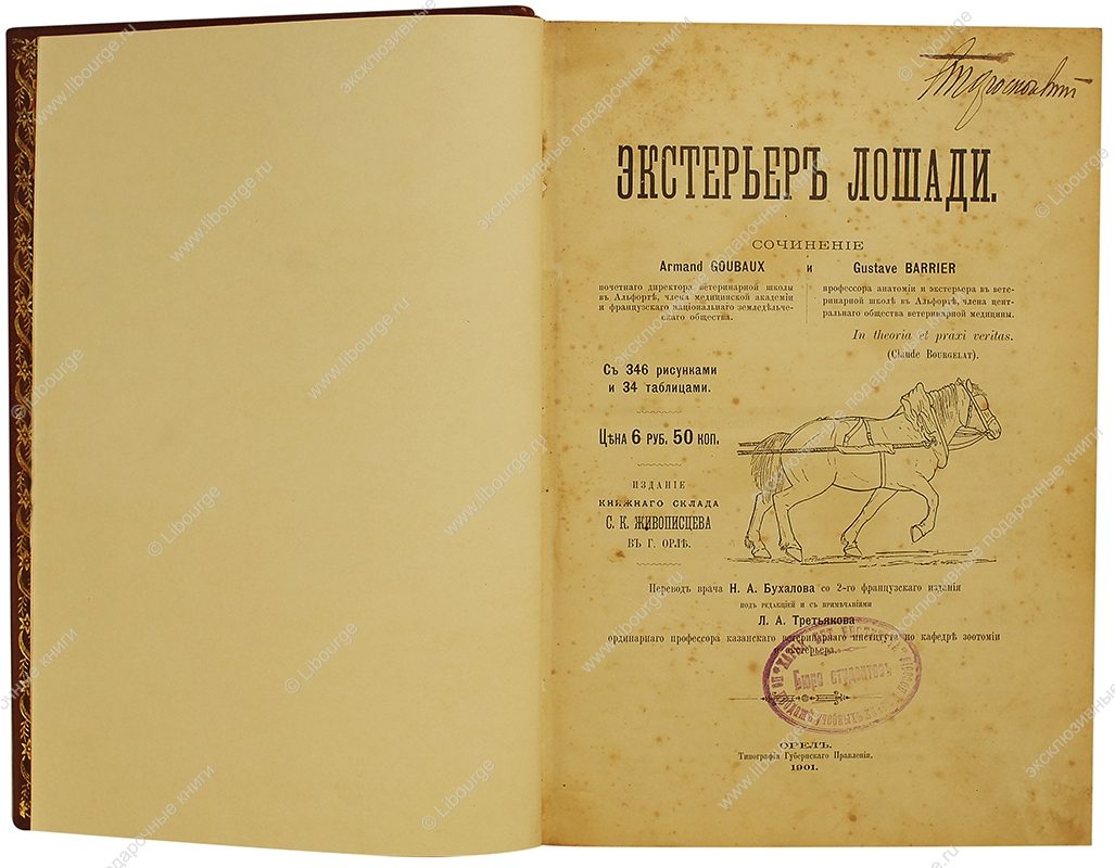 Одно из самых полных изданий по экстерьеру лошади. Перевод врача Н.А.Бухалова со 2-го французскаго издания под редакцией и с примечаниями Л.А.Третьякова ординарнаго профессора казанскаго ветеринарнаго института по кафедре зоотомии и экстерьера. С 346 рисунками и 34 таблицами. Книга переведена на основные европейские языки и продолжает сохранять свою ценность до сих пор. Адресована ветеринарам, зоотехникам и коннозаводчикам. Она имеет непреходящее значение в деле рационального разведения пород лошадей, увеличения работоспособности и торговой ценности отдельных особей. В книге обобщен колоссальный фактический материал, обработанный методами точных наук, в том числе статистики. Авторы рассматривают механику организма лошади, показывают, как он должен развиваться и действовать при благоприятных условиях. Даны все основные понятия и термины, определяются критерии красоты, изучены недостатки, болезни, изъяны и пороки лошади. Последовательно исследуются все части тела животного, анатомия органов и их систем, их функциональные и эстетические особенности. Показаны признаки породистости и черты различий пород. Большое внимание авторы уделяют представлениям о соразмерности и пропорциях частей тела лошади. Показаны условия, которым должны удовлетворять породы разного назначения: тяжеловозы, беговые лошади и смешанные типы. Изучается и характер отдельных особей, ее отзывчивость, горячность, раздражительность.