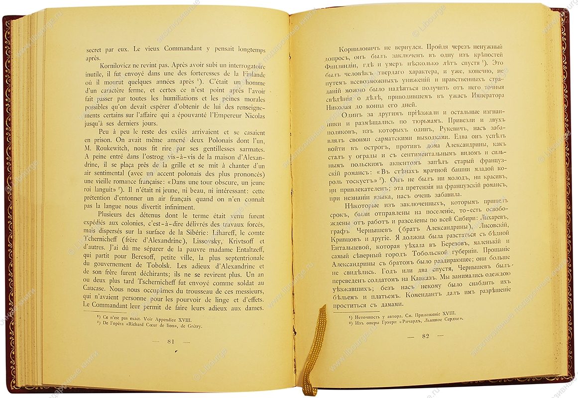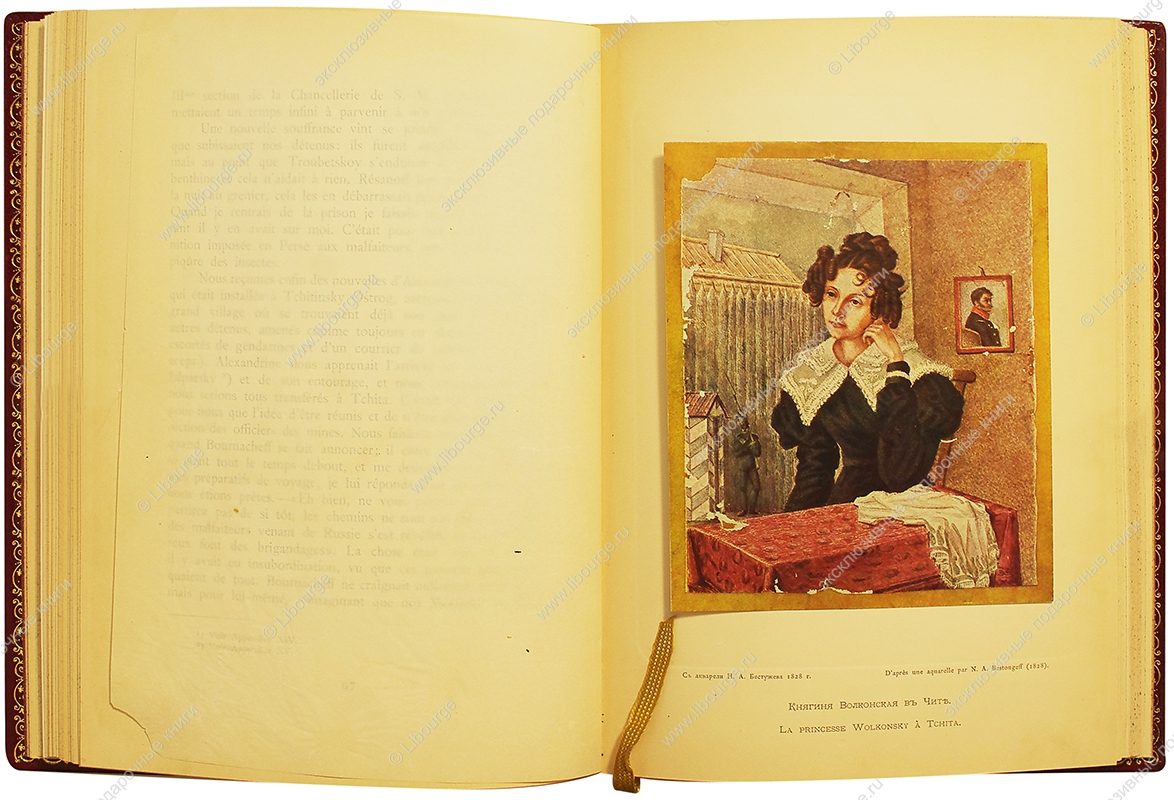 Княгиня Мария Николаевна Волконская, жена декабриста С.Г.Волконского, была одной из первых среди жен декабристов, которая преодолев сопротивление семьи, последовала в 1827 году за мужем в Сибирь, где жила до 1855 года. В своих "Записках", созданных после возвращения в Москву, Волконская ярко описала каторжный режим, охарактеризовала многих декабристов, оставила сведения о быте, нравах, культуре и отношении населения Сибири к декабристам. Именно ее подвиг был воспет Н.А.Некрасовым в поэме "Русские женщины". Издание на русском и французском языках.