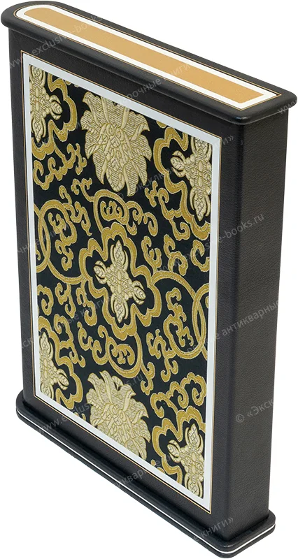 Французский кожаный переплёт ручной работы. Шагреневая кожа чёрного цвета (Италия). Аппликации из золотой, красной и белой кожи. Обрезы с трёх сторон окрашены и торшонированы с золочением. Тиснение красной и золотой фольгой. Капталы шёлковые ручного плетения. Форзацы из жаккарда и дизайнерской бумаги. Кожаные слизуры. Дублюры украшены двойным золотым орнаментом. Подарочный полукожаный футляр с кожаной мозаикой, жаккардом, постаментом, крышкой и золотым тиснением.