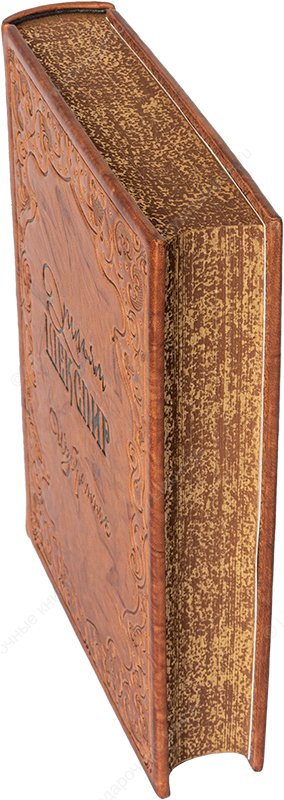 Кожаный переплёт ручной работы. Бежевая натуральная кожа особой выделки. Тиснение блинтовое и золотой фольгой. Обрезы с трех сторон окрашенные и торшонированные с золочением. Форзацы из мраморной бумаги ручной работы. Кожаные слизуры. Дублюры окатаны с 4-х сторон орнаментом вручную блинтовым тиснением. Капталы кожаные. Подарочный футляр с мраморной бумагой и тиснением.