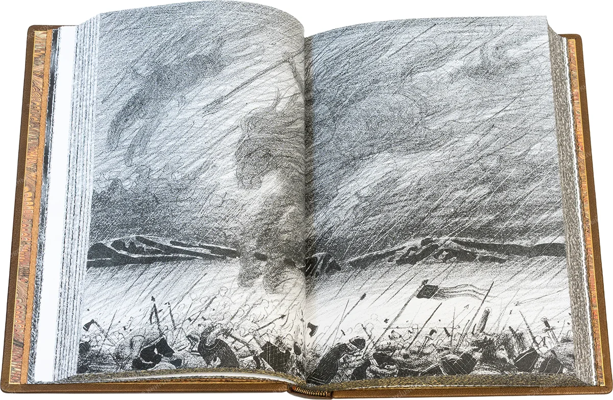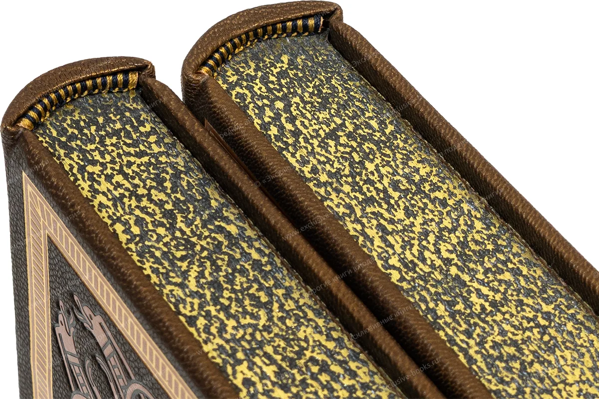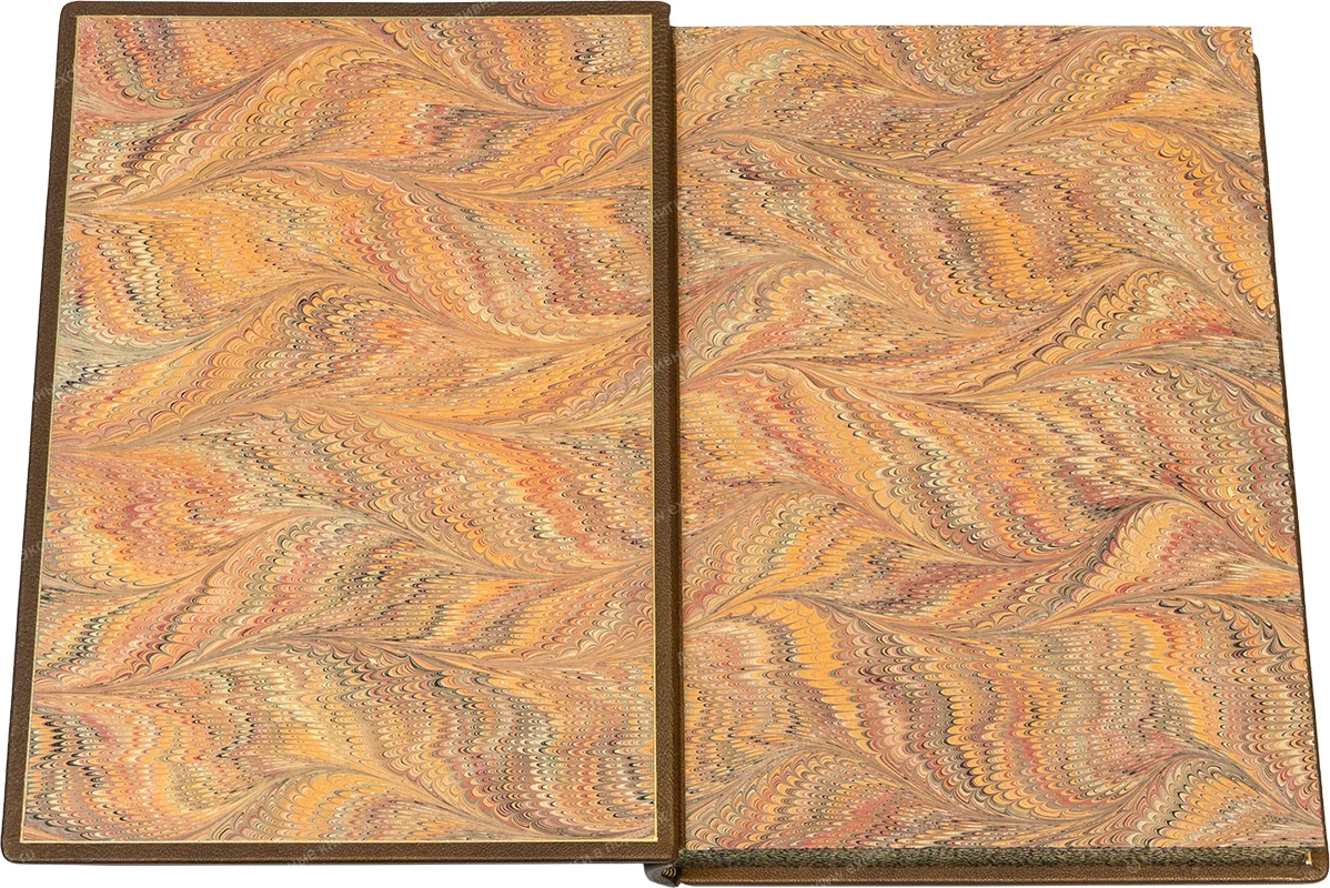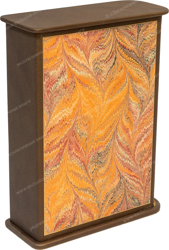 Французский кожаный переплёт ручной работы. Кожа козы бронзового цвета (Италия). Тиснение бежевой, чёрной и золотой фольгой. Обрезы с трёх сторон окрашены и торшонированы с золочением. Капталы шёлковые ручного плетения. Форзацы из мраморной бумаги ручного окрашивания (Италия). Кожаные слизуры. Дублюры украшены золотым тиснением. Подарочный футляр с постаментом, крышкой, мраморной бумагой и золотым тиснением.