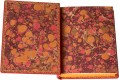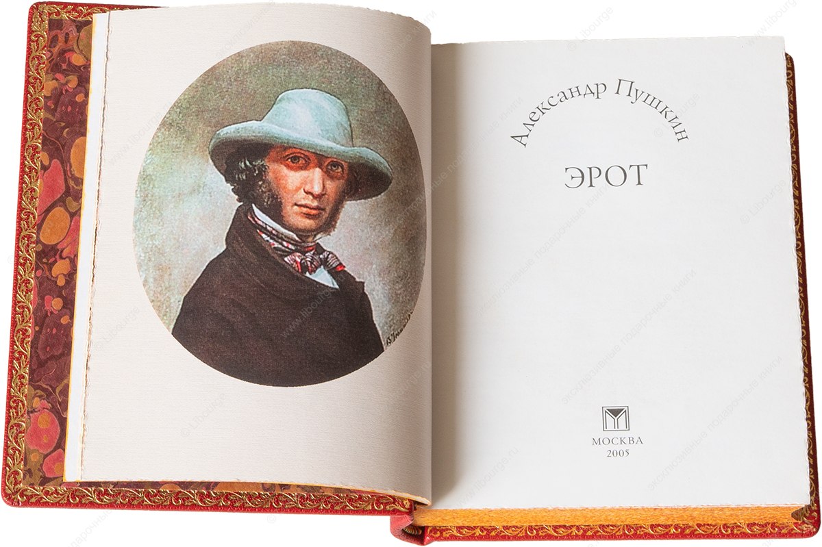 Французский кожаный переплёт полностью ручной работы. Красная шагреневая кожа (Италия). Аппликация из бордовой кожи. Портрет автора в технике барельеф в золотом оформлении. Тиснение золотой фольгой. Обрезы торшонированные, тонированные и золоченые. Капталы шёлковые двухцветные ручного плетения. Форзацы из мраморной бумаги ручного окрашивания (Италия). Кожаные слизуры. Дублюры украшены орнаментом. Подарочный футляр с окном под портрет.