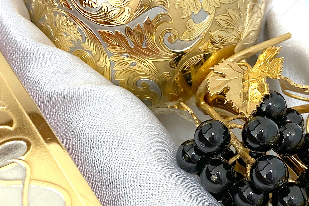 Цельнокожаный переплет ручной работы. Форзацы составные из мраморной бумаги на кожаных слизурах. Оформление в технике Златоустовской гравюры. Техника исполнения: многоступенчатый цикл нанесения, художественная рисовка кистью, травление, гравировка иглой и резцом, никелирование, золочение. Инкрустация камнями. Декоративные элементы выполнены методом ручной резьбы по металлу. Материалы: латунь, покрытие никель, золото, серебро, чернение серебра, фианиты - 300 шт. Бокал украшен натуральными гранатами, а виноградная гроздь выполнена из обсидиана. Деревянная шкатулка с ложементами. Возможно изготовление подарочного футляра на выбор.