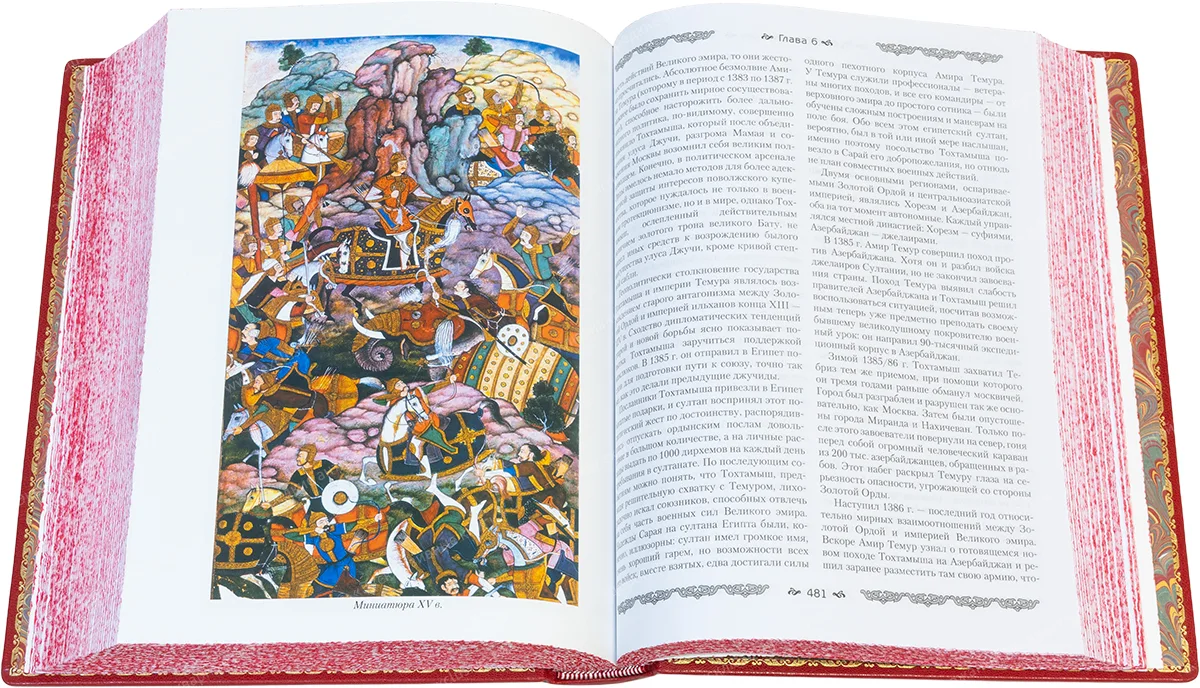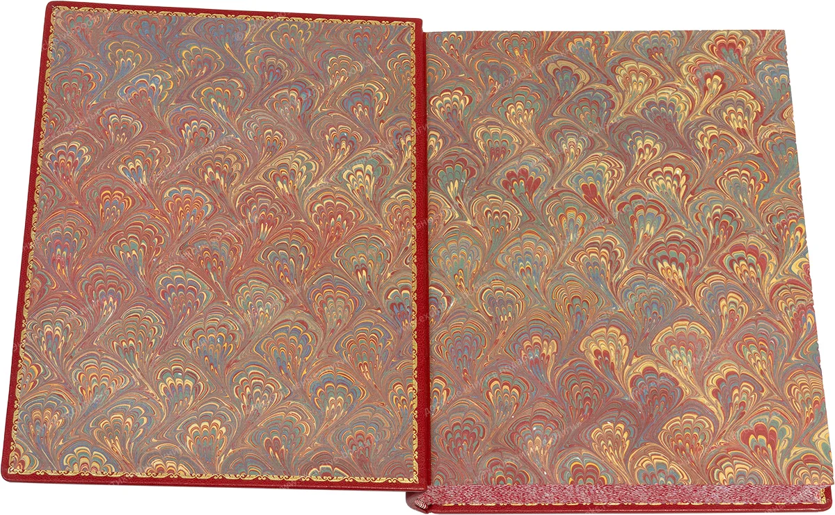 Французский кожаный переплёт ручной работы. Блок сшит на льняных шнурах (Германия). Кожа козы красного цвета (Италия). Аппликация из белой кожи. Тиснение золотой и белой фольгой. Обрезы с трёх сторон шлифованные, окрашенные в красный цвет и торшонированные с белением. Капталы шёлковые (Германия), двухцветные, ручного плетения. Форзацы из мраморной бумаги ручного окрашивания. Кожаные слизуры. Дублюры окатаны орнаментом. Подарочный кожаный футляр с мраморной бумагой и золотым тиснением.