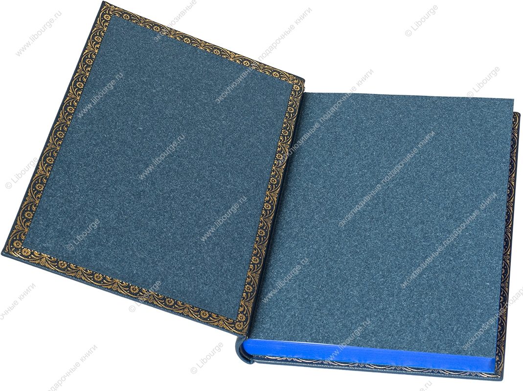 Французский кожаный переплет ручной работы. Шагреневая кожа темно-синего цвета. Блинтовое и золотое тиснение на крышах и корешке. Аппликации из бордовой кожи. Обрезы шлифованы и окрашены с трех сторон в ярко-синий цвет. Кожаные капталы. Форзацы из износостойкой английской бумаги Khepera на кожаной слизуре. Дублюры окатаны вручную с золочением с четырех сторон. Блок напечатан на качественной белой мелованной бумаге. Черно-белые иллюстрации. Полукожаный подарочный футляр.