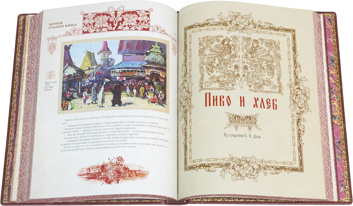 В подарочную книгу «Легенды русского народа» вошли русские легенды, в разное время записанные такими выдающимися собирателями народной старины, как Владимир Даль, Александр Афанасьев, Александр Бурцев и другими. После крещения Руси фантазия народа не позабыла тех образов, в которых некогда представлялись ей отношения человека и природы. Моменты истории, описанные в Ветхом и Новом Заветах, русские люди приняли в свои сказания. Так родились легенды и предания — жанр не менее увлекательный и познавательный, чем народная сказка.