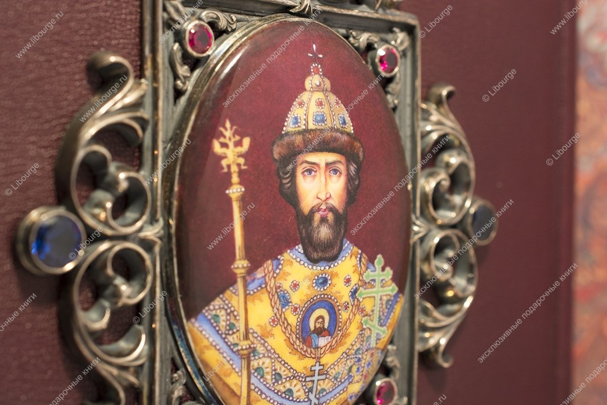 Французский переплёт ручной работы на трёх шнурах. Кожа шегрень-атлас, тёмная слива (фирма Рельма, Франция). Тиснение серебряной фольгой Эксклюзивная мраморная бумага Обрез полированный и окрашенный вручную с трёх сторон Форзац раздельный, составной на кожаной слизуре. Украшения переплёта общим весом 444 грамм Серебро 900 пробы, чернение Цветные фианиты бриллиантовой огранки. Портретная эмалевая миниатюра по меди (Федоскино). Возможно изготовление подарочного футляра на выбор.