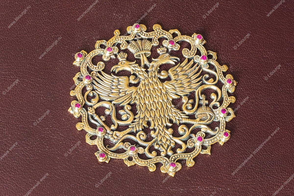 Французский цельнокожаный переплет ручной работы на шнурах. Натуральная переплетная кожа. Цвет Коричневый. Форзац составной на кожаной слизуре. Дизайнерская бумага. Каптал двойной наборный, ручное плетение из шелковых нитей. Обрез торшонированный золотой фольгой. Ляссе шелковое. Украшение переплета: тиснение полиграфической фольгой. Ювелирное литье: накладки состаренная латунь. Ручная работа. Ювелирные вставки: фианиты бриллиантовой огранки. Подарочный футляр.