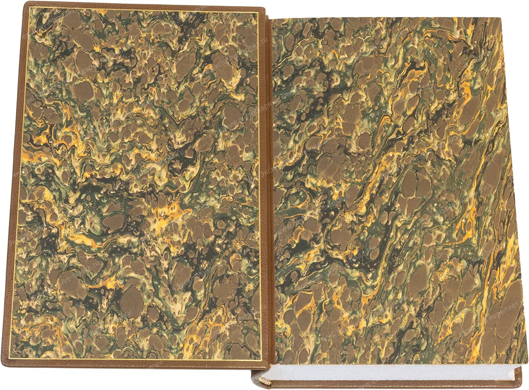 Французский кожаный переплёт ручной работы. Шагреневая кожа оливкового цвета (Италия). Аппликации из красной и чёрной кожи. Тиснение золотой фольгой. Верхний обрез окрашен и гравирован орнаментом, передний и нижний обрезы - торшонированы. Форзацы из мраморной бумаги ручного окрашивания. Кожаные слизуры. Дублюры украшены орнаментом. Капталы шёлковые двухцветные ручного плетения. Подарочный футляр с мраморной бумагой и золотым тиснением.
