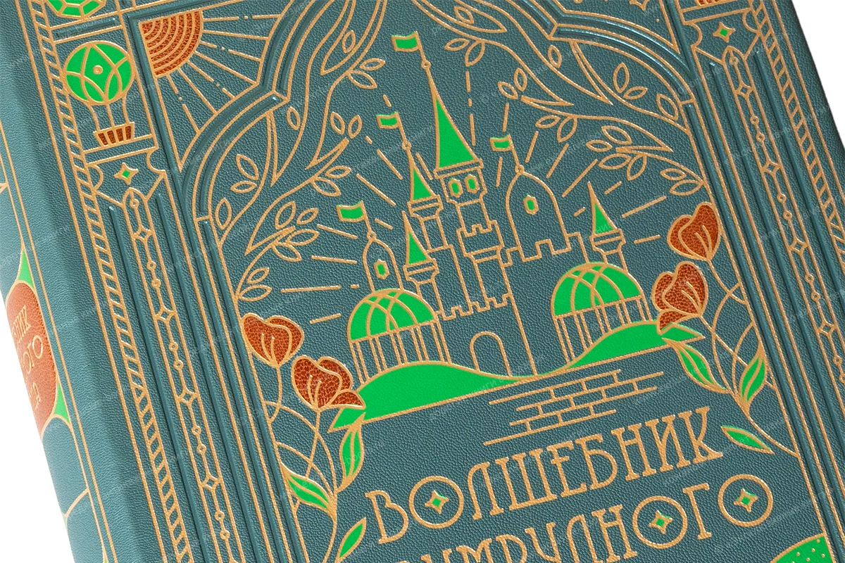 Французский кожаный переплёт ручной работы. Серо-зелёная кожа козы. Аппликации из бежевой шагреневой кожи. Тиснение золотой и зелёной фольгой. Обрезы с трёх сторон с ручной художественной росписью. Кожаные капталы. Форзацы из дизайнерской бумаги. Кожаные слизуры. Дублюры украшены золотой линией. Подарочный полукожаный футляр с мраморной бумагой и тиснением.