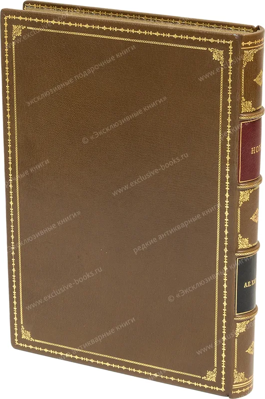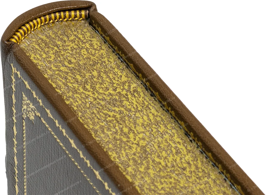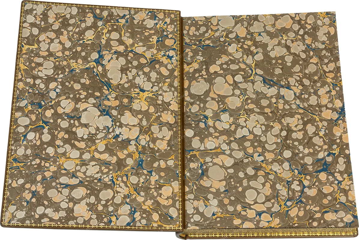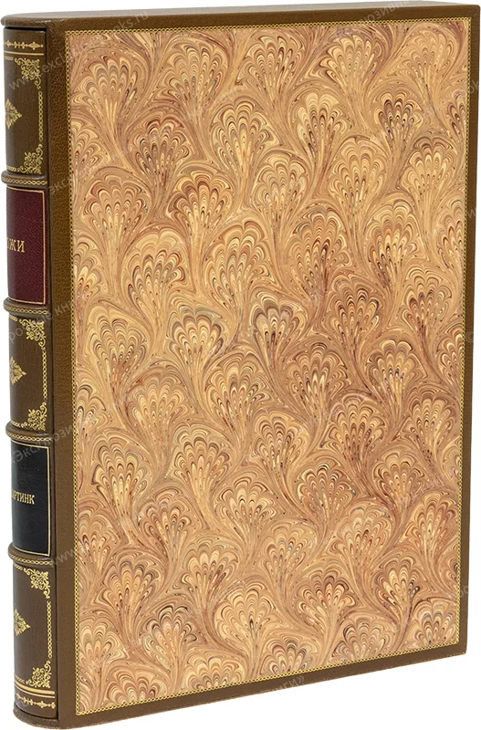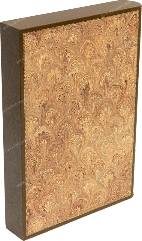 Французский переплёт ручной работы. Натуральная кожа (Италия). Аппликации из красной и чёрной кожи на корешке. Ручное тиснение золотой фольгой. Форзацы из мраморной бумаги ручного окрашивания. Кожаные слизуры. Дублюры украшены орнаментом. Обрезы окрашены и торшонированы с золочением вручную. Капталы шёлковые ручного плетения. Подарочный футляр с мраморной бумагой и золотым тиснением.