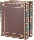 Французский переплет ручной работы из шагреневой кожи. Цветные кожаные аппликации на корешках. Тиснение золотой фольгой. Форзацы из мраморной бумаги ручного раскраса. Обрезы окрашены и торшонированы с золочением. Дублюры окатаны орнаментом с золочением. Подарочный футляр.