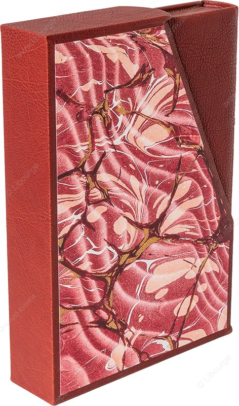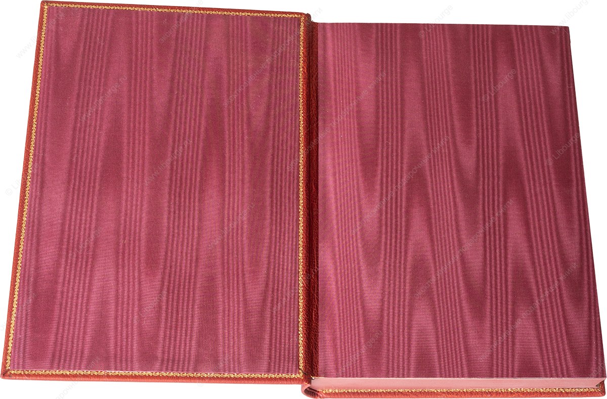 Кожаный переплёт ручной работы. Кожа КРС особой выделки, терракотового цвета (Италия). Миниатюра по сюжету произведения: карвинг по коже с ручной росписью. Тиснение на корешке золотой фольгой. Обрезы с трёх сторон шлифованные и тонированные. Шёлковые капталы. Форзацы из муара. Кожаные слизуры. Дублюры украшены орнаментом. Подарочный футляр.