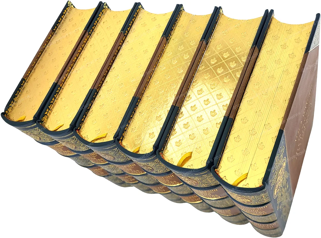 Кожаные переплеты ручной работы. Корешки украшены бинтами и золотистым тиснением; дублюры окатаны вручную бордюрным орнаментом. Форзацы выполнены из специального переплетного материала, с тиснением. Верхний обрез позолочен и гравирован вручную, правый и нижний обрезы торшонированы. Каждая книга помещена в футляр с кожаной окантовкой.