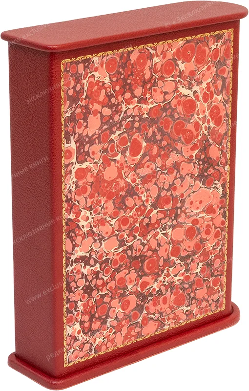 Французский кожаный переплёт ручной работы. Красная шагреневая кожа. Аппликации из жёлтой, бордовой и зеленой кожи. Тиснение золотой фольгой. Обрезы с трёх сторон тонированные и гравированы орнаментом. Форзацы из мраморной бумаги ручного окрашивания. Кожаные слизуры. Дублюры украшены орнаментом. Кожаные капталы. Подарочный полукожаный футляр с постаментом.