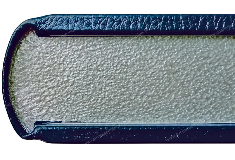 Французский цельнокожаный переплет ручной работы на шнурах. Натуральная переплетная кожа. Форзац составной на кожаной слизуре. Дизайнерская бумага. Каптал двойной наборный, ручное плетение из шелковых нитей. Обрез торшонированный. Ляссе шелковое. Тиснение полиграфической фольгой. Накладка: художественное литье, вставки из циркония. Возможно изготовление подарочного футляра на выбор.