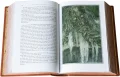 Кожаный французский переплёт ручной работы. Блинтовое и золотое тиснение. На корешке аппликация из тёмной кожи с тиснением эмблемы Джона Толкина. Обрезы окрашены и торшонированы с золочением. Кожаные капталы. Форзацы на кожаных слизуре в виде карты Средиземья, на золотой бумаге. Подарочный футляр с мраморной бумагой и тиснением.