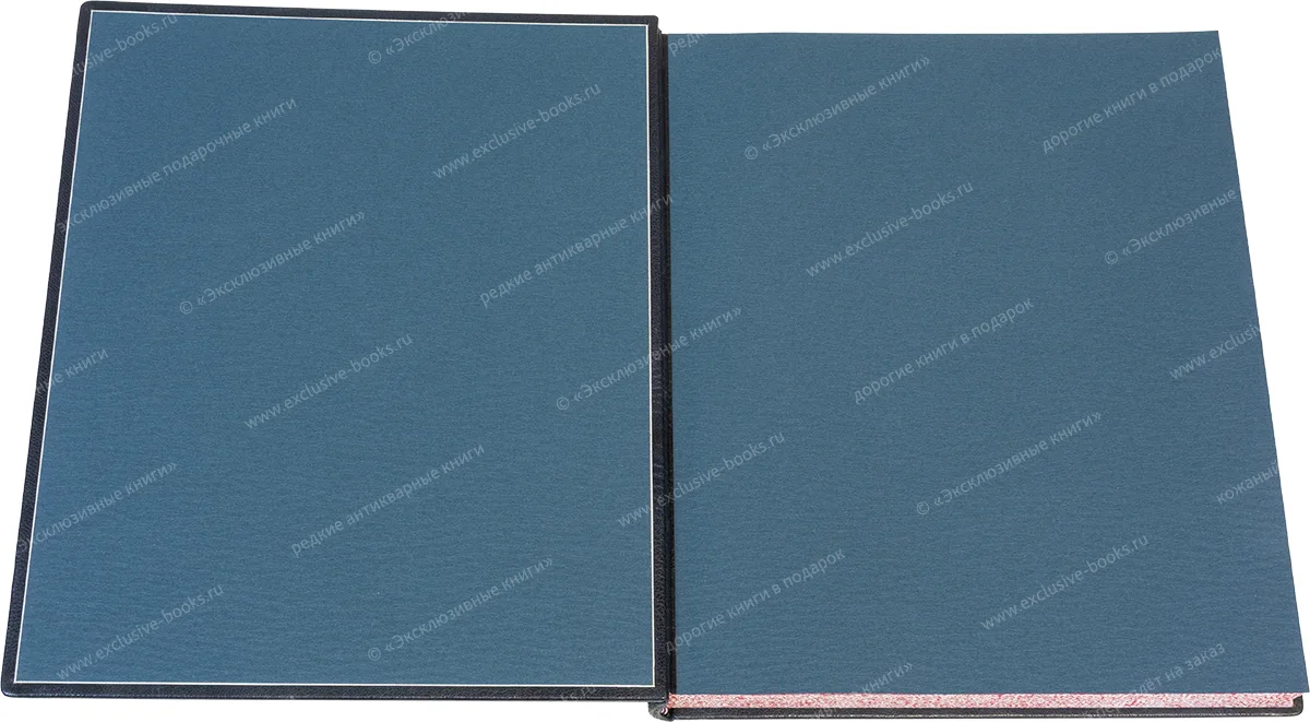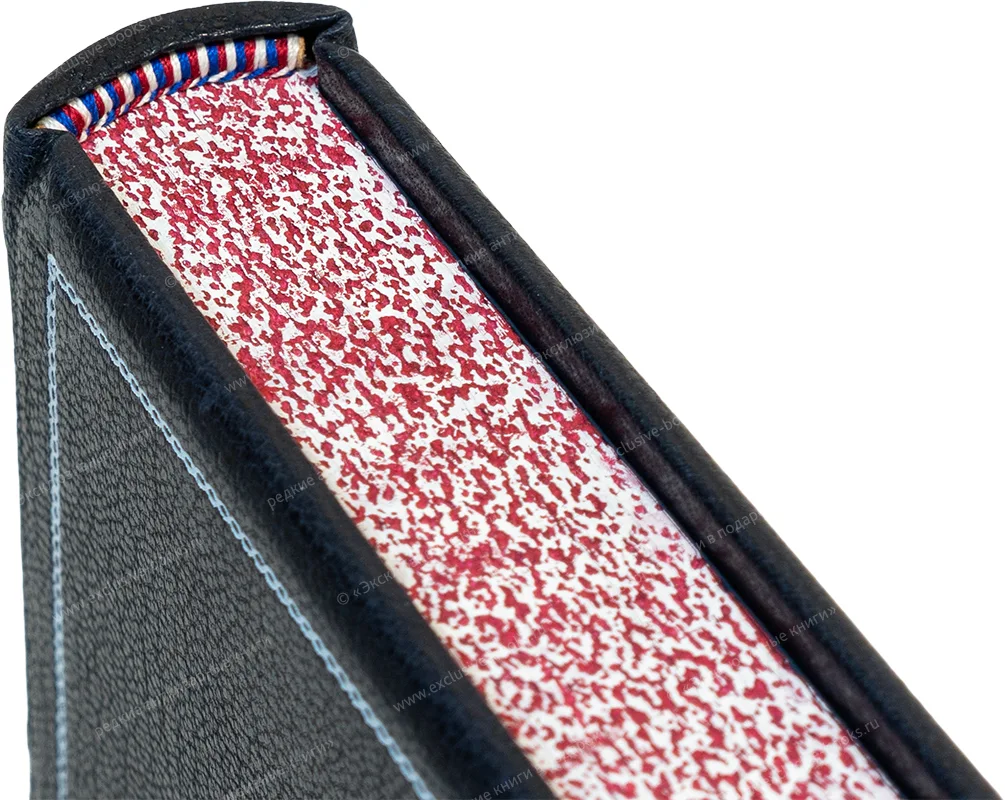 Французский кожаный переплёт полностью ручной работы. Тёмно-синяя кожа козы особой выделки. Тиснение серебряной, белой и красной фольгой. Обрезы с трёх сторон окрашены и торшонированы с белением. Капталы шёлковые трёхцветные ручного плетения. Форзацы из дизайнерской бумаги. Подарочный футляр с постаментом и серебряным тиснением.
