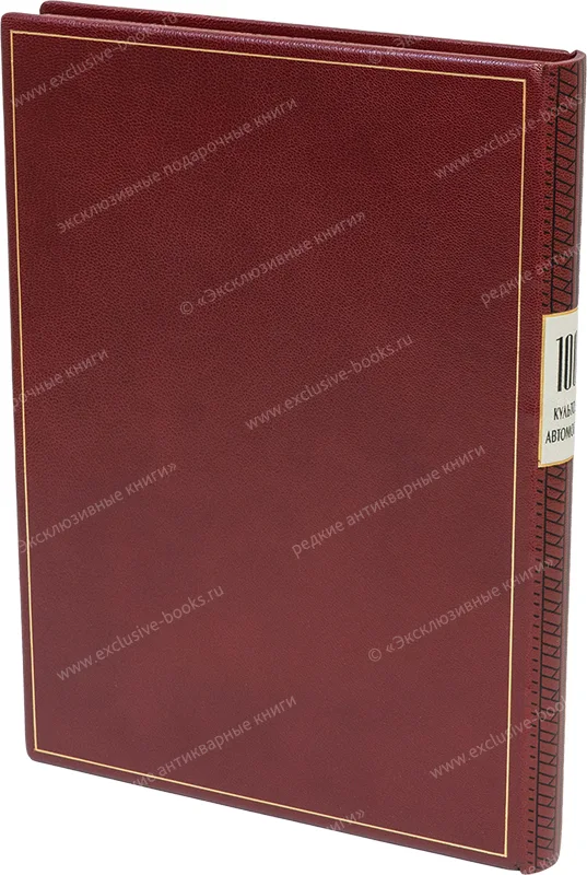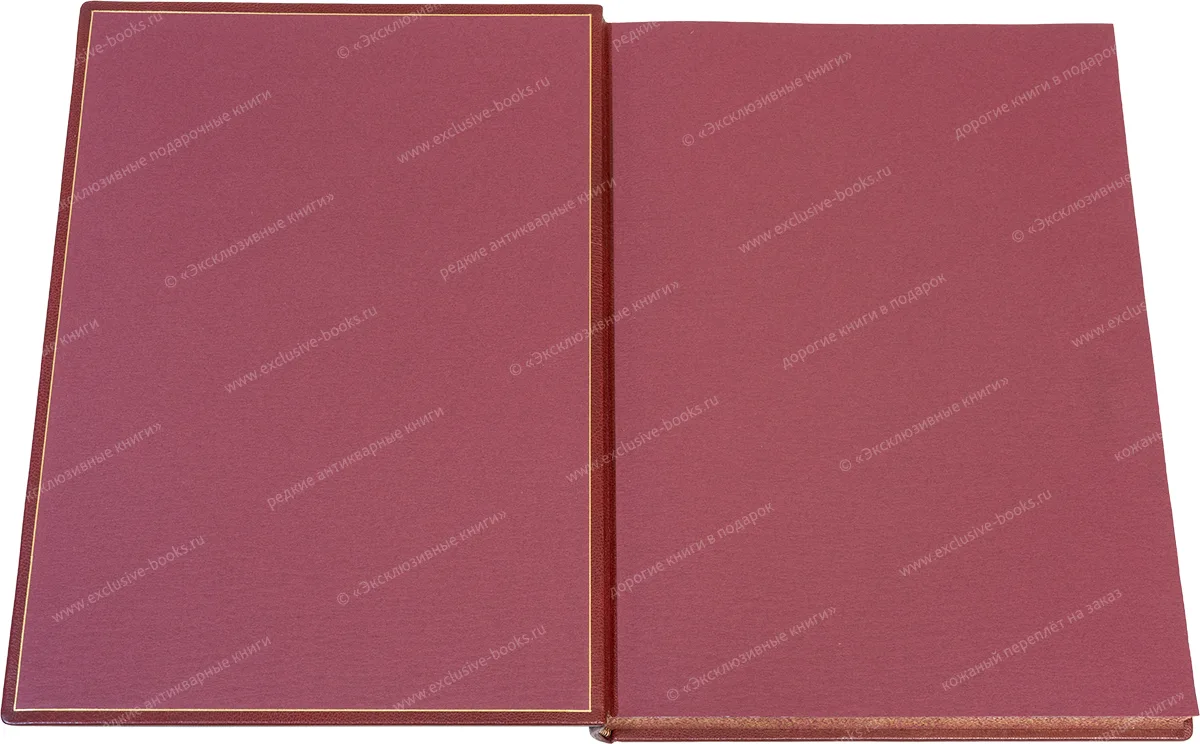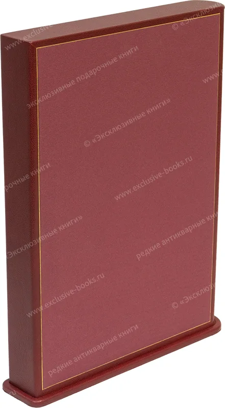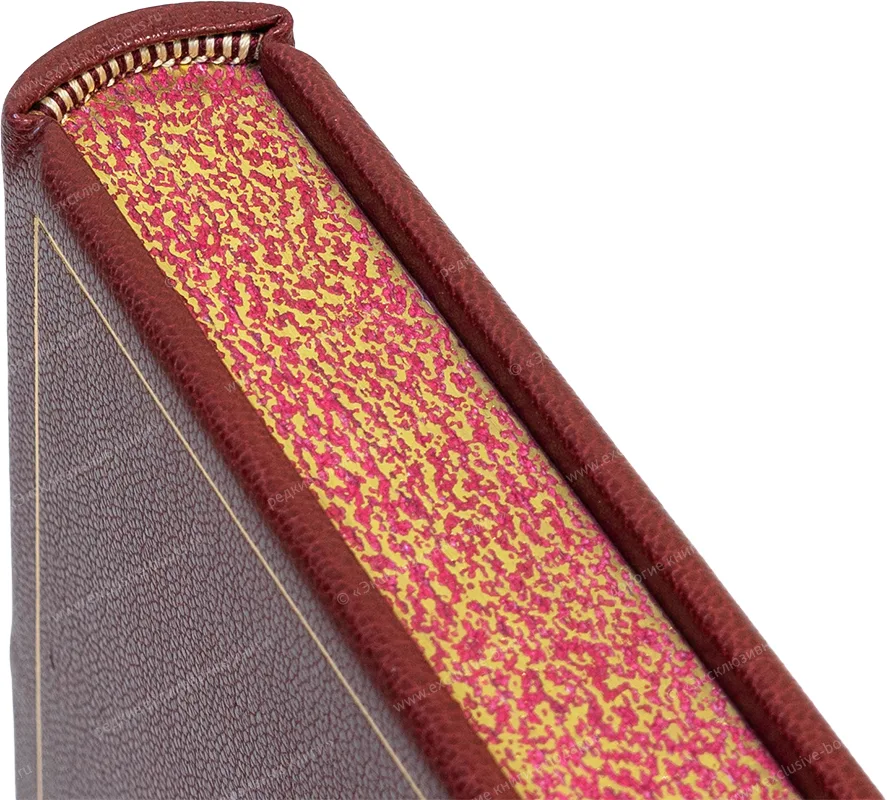 Французский кожаный переплёт ручной работы. Малиновая шагреневая кожа. Аппликация из белой кожи. Тиснение золотой и чёрной фольгой. Обрезы с трёх сторон окрашены и торшонированы с золочением. Капталы шёлковые ручного плетения. Форзацы из дизайнерской бумаги. Кожаные слизуры. Дублюры украшены тиснением тонкой линии. Подарочный полукожаный футляр с постаментом.