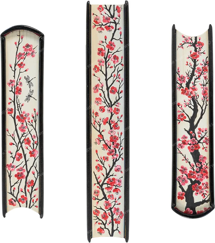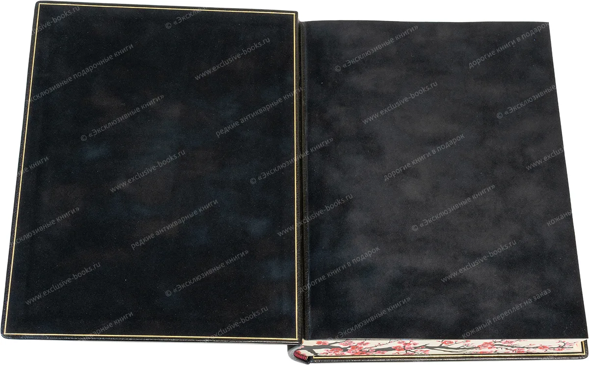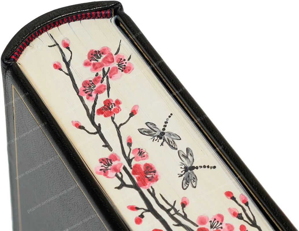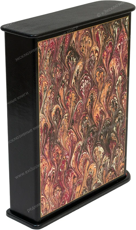 Французский кожаный переплёт ручной работы. Чёрная кожа козы (Италия). Аппликации из красной и белой кожи. Тиснений золотой, красной и белой фольгой. Обрезы с трёх сторон с ручной художественной росписью. Капталы шёлковые, двухцветные ручного плетения. Форзацы из чёрного бархата. Кожаные слизуры. Дублюры украшены золотой линией. Подарочный полукожаный футляр с постаментом, крышкой, мраморной бумагой и золотым тиснением.