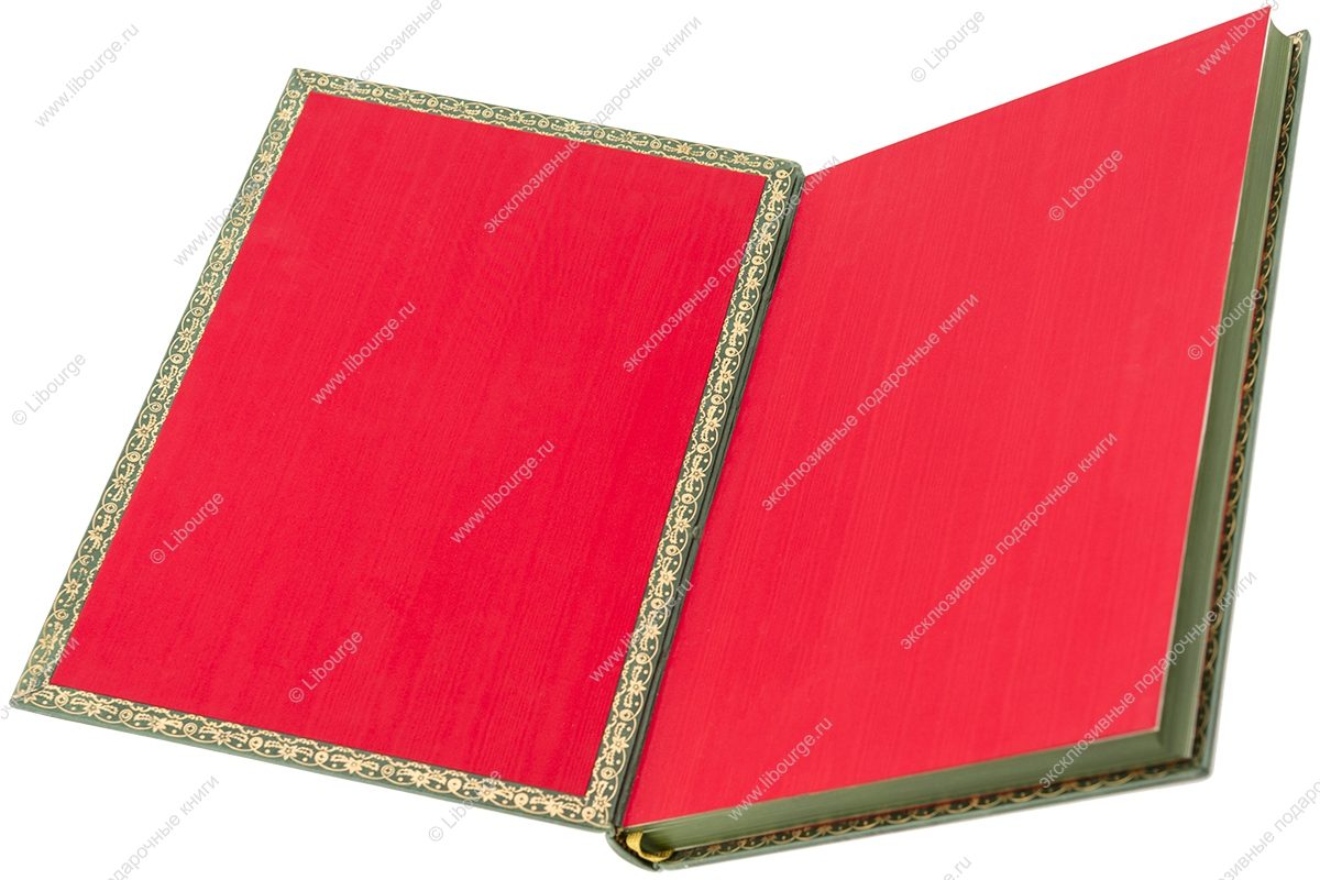 Французский кожаный переплет ручной работы. Блинтовое и золотое тиснение. Накладка из красной кожи на корешке. Форзац из муара на кожаной слизуре. Дублюра с золочением. Верхний обрез окрашен и гравирован вручную орнаментом с золочение. Передний и нижний обрезы - окрашены. Возможно изготовление подарочного футляра на выбор.