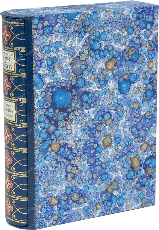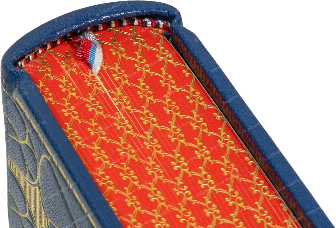 Книга сшита вручную на шнуры по старинной технологии французского переплёта. Переплёт цельнокожаный с золотым, красным и белым тиснением. Аппликации из белой кожи. Обрезы с трёх сторон тонированы и гравированы орнаментом вручную. Форзацы из мраморной бумаги. Подарочный футляр.