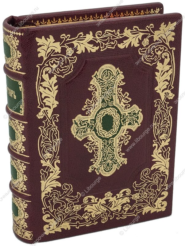 Французский кожаный переплет из натуральной шагрени. Тиснение золотой фольгой. Обрезы с художественной росписью. Шелковые плетеные капталы. Шелковое ляссе. Форзацы из дизайнерской бумаги с золотым тиснением. Подарочный полукожаный футляр с мраморной бумагой ручного окраса.