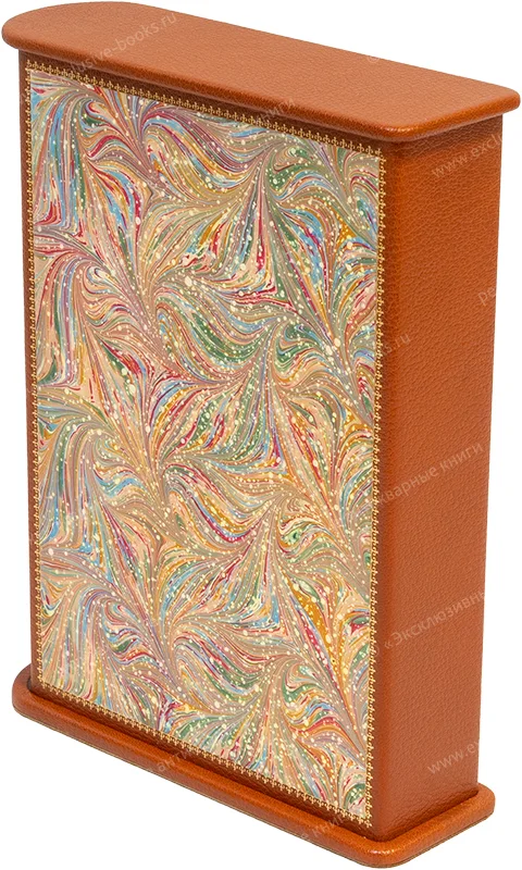 Французский кожаный переплёт ручной работы. Шагреневая кожа тёмно-оранжевого цвета (Италия). Блинтовое и золотое тиснение на крышах и корешке. Аппликации из бронзовой кожи. Обрезы шлифованные с ручной художественной росписью с трёх сторон. Капталы шёлковые ручного плетения. Форзацы из мраморной бумаги ручного окраса (Италия), на кожаных слизурах. Дублюры окатаны орнаментом вручную с золочением с четырёх сторон. Подарочный футляр с постаментом, мраморной бумагой и золотым тиснением.