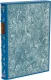 Французский кожаный переплёт ручной работы. Шагреневая кожа синего цвета (Италия). Тиснение золотой фольгой. Обрезы с трёх сторон шлифованные, тонированные и торшонированные с золочением. Капталы шёлковые двухцветные ручного плетения. Форзацы из мраморной бумаги (Франция). Кожаные слизуры. Дублюры украшены орнаментом. Подарочный полукожаный футляр с мраморной бумагой и тиснением орнамента.