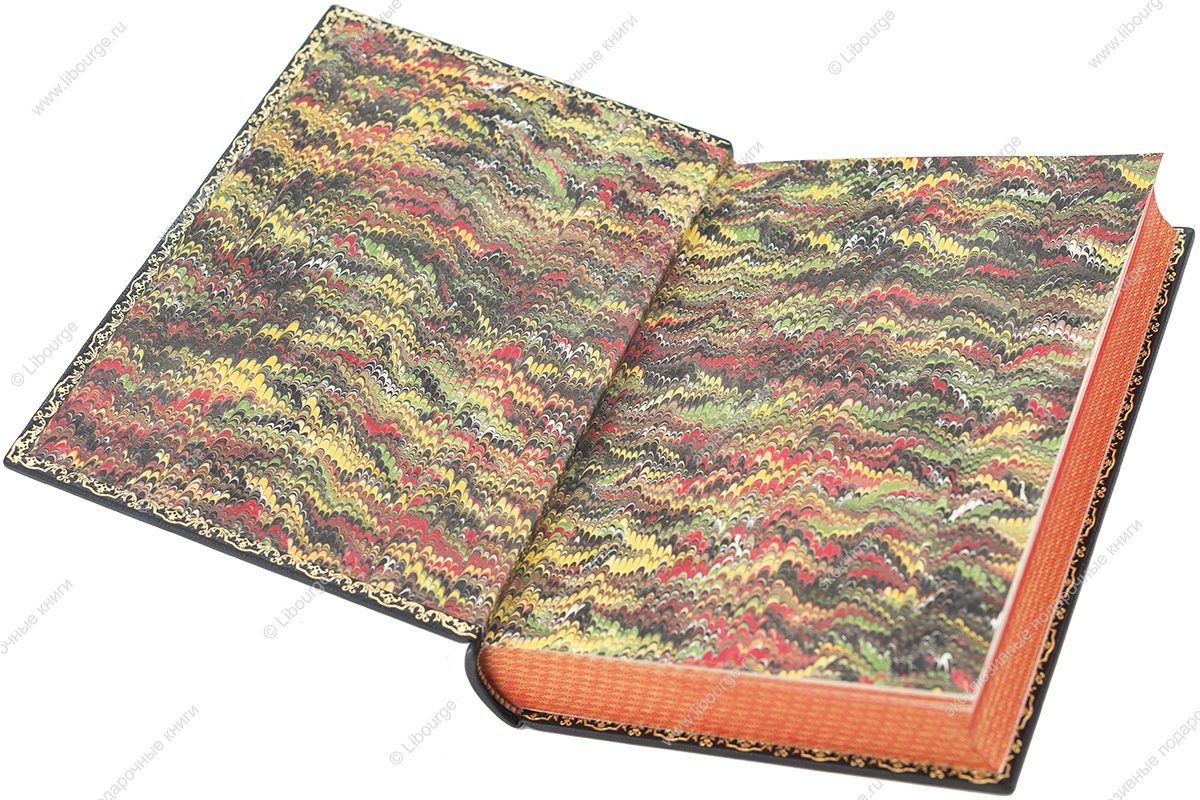 Французский переплет ручной работы. Натуральная шагреневая кожа. Форзац из мраморной бумаги. Верхний обрез окрашен и гравирован с золочением вручную. Боковой и нижний обрезы торшонированы. Орнамент дублюры выполнен вручную с золочением. Блок отпечатан на качественной дизайнерской бумаге. Подарочный футляр.