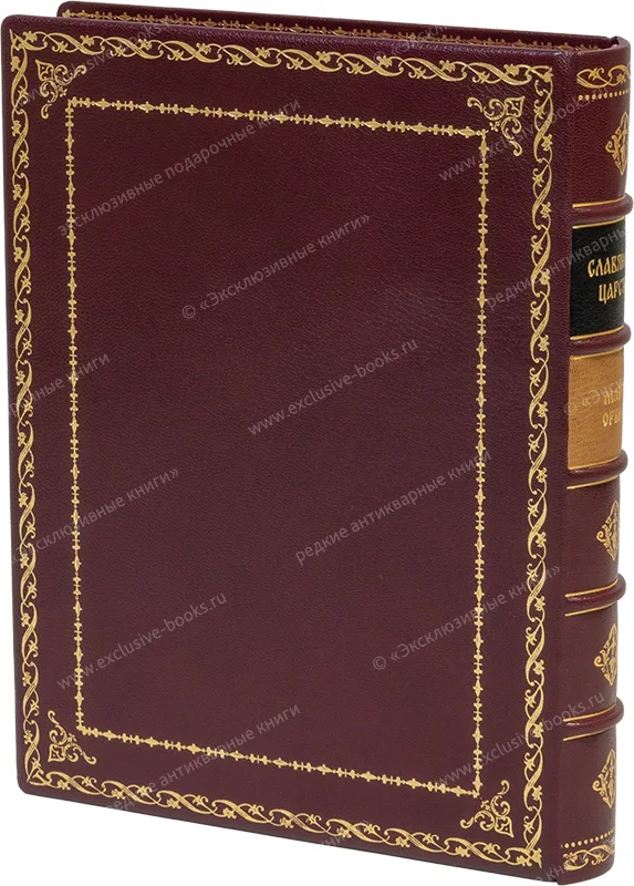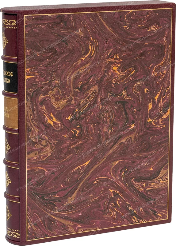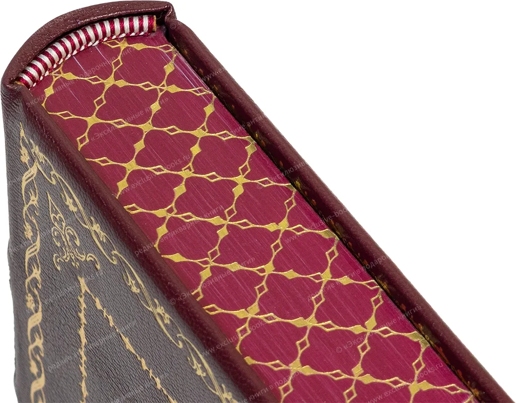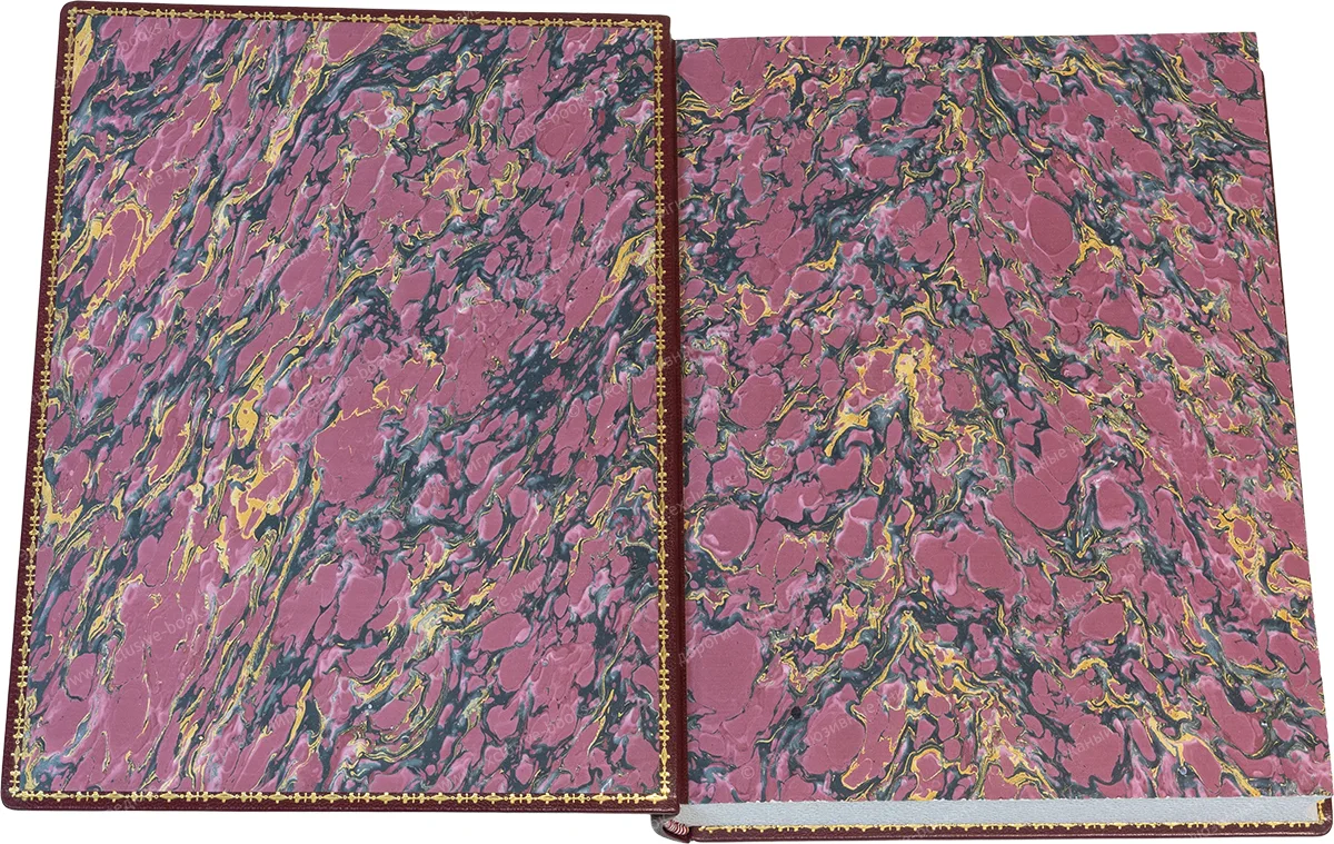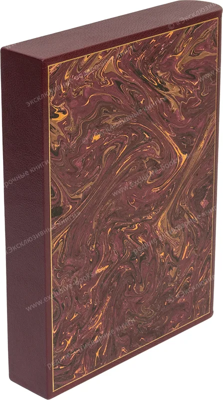 Французский кожаный переплёт ручной работы. Бордовая кожа козы (Италия). Аппликация на корешке из черной и бежевой кожи. Тиснение золотой фольгой. Верхний обрез тонирован и гравирован орнаментом; передний и нижний обрезы - торшонированы. Капталы шёлковые ручного плетения. Форзацы из мраморной бумаги ручного окрашивания (Франция). Кожаные слизуры. Дублюры украшены орнаментом. Подарочный футляр с мраморной бумагой и золотым тиснением.