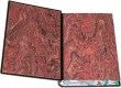 Французский кожаный переплёт ручной работы. Чёрная шагреневая кожа. Авторский дизайн. Тиснение блинтовое, золотой и красной фольгой. Аппликация из красной кожи. Ручная роспись обрезов. Капталы шёлковые, ручного плетения. Форзацы из мраморной бумаги. Эксклюзивный подарочный кожаный футляр с жаккардом.