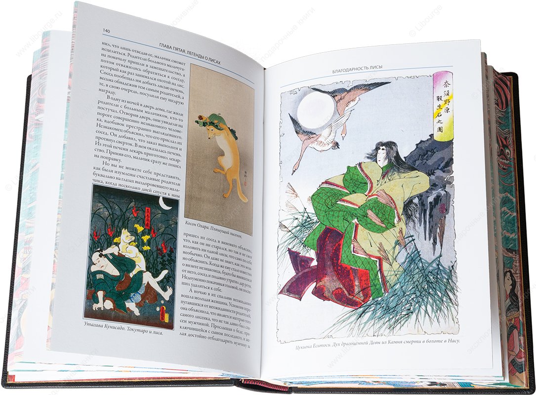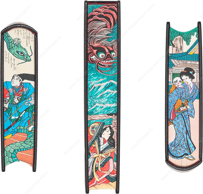 Издание украшено несколькими сотнями великолепных цветных репродукций японских гравюр XVII — начала XX веков. Благодаря мастерству их авторов: Хиросиге, Куниёси, Куниса-да, Ёситоси, Тиканобу, Харунобу и многих других знаменитых японских художников, читатель может воочию представить себе тот удивительный мир, в котором живут и действуют древние боги, герои, легендарные воины, демоны, оборотни, приведения и драконы.
