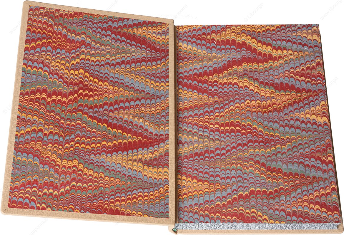 Французский кожаный переплёт ручной работы. Блок сшит на льняных шнурах (Германия). Бежевая шагреневая кожа (Италия). Аппликации из зеленой, белой и синей кож. Тиснение золотой и серебряной фольгой. Обрезы с трёх сторон шлифованные, тонированные и торшонированные с золочением. Форзацы из мраморной бумаги ручного окрашивания. Капталы шелковые (Германия), ручного плетения. Кожаные слизуры. Подарочный футляр с мраморной бумагой и тиснением орнамента.