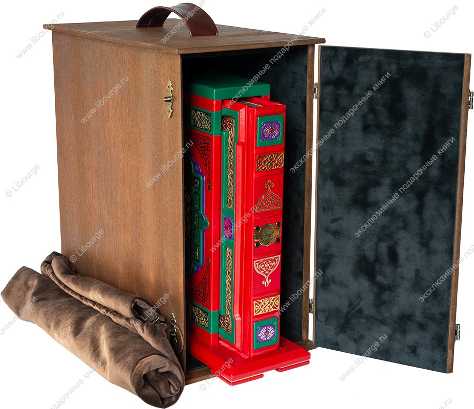 Полностью ручная работа. Красная, зеленая и синяя телячьи кожи. Тиснение золотой фольгой. Ювелирные накладки из латуни. Форзацы из холста. Кожаные капталы. Подставка из кожи с бархатом и латунными вставками. Подарочный короб, бархатный мешок. Возможно изготовление подарочного футляра на выбор.