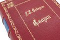 Кожаный французский переплет ручной работы. Шагреневая кожа (цвет на выбор). Окрашенные и торшонированные обрезы с золочением. Шелковые капталы. Ручное тиснение золотой фольгой. Аппликация цветной кожей на корешке. Возможно изготовление подарочного футляра на выбор.